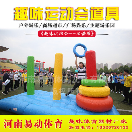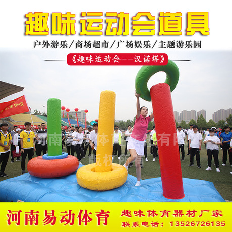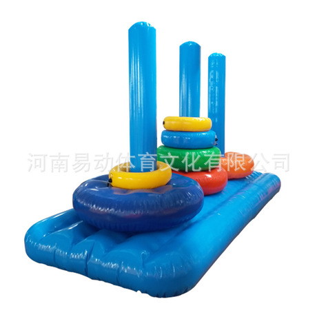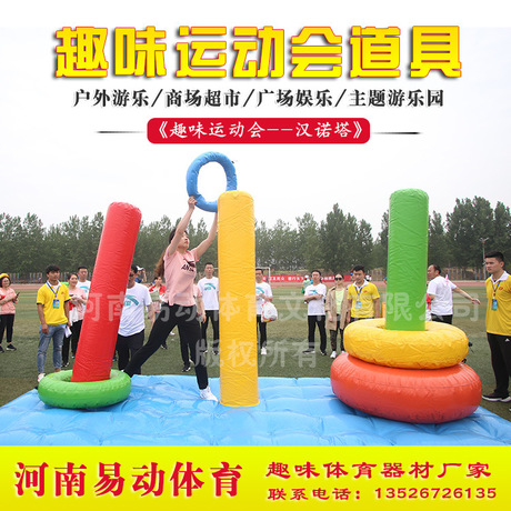 方法:比赛开始前,四个充气圈在左边的柱子上,顺序为从上到下由小到大,四名队员站在左侧,任务是把左侧的四个充气圈移动到右侧的气柱上,每个充气圈必须经过中间的气柱,并且始终是小的充气圈在上边。每次一名队员只能移动一次,然后换另外一名队员移动充气圈,直至后四个充气圈也是由小到大放在右侧的充气柱上。