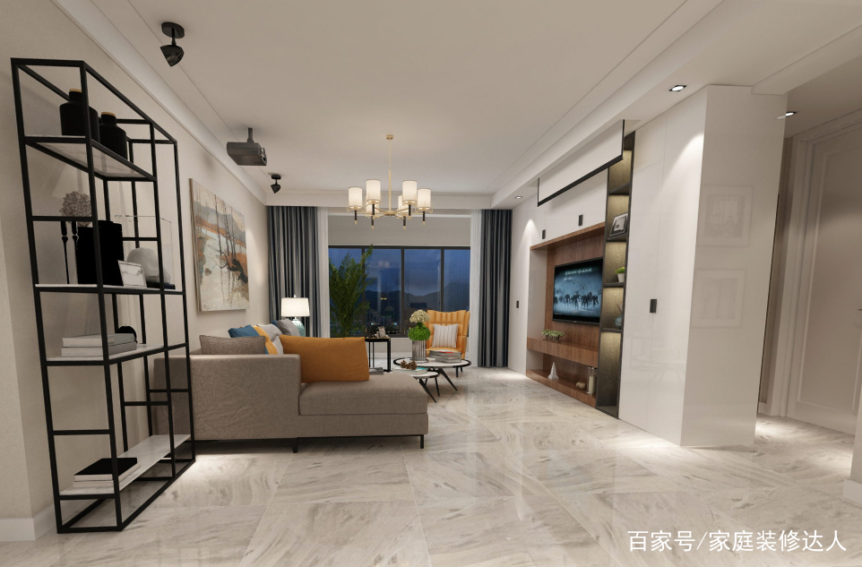 本案设计:刘老师在设计电视和沙发的背景墙、地毯、窗帘等软饰上,进行了完美的色彩糅合,L半弧形的沙发造型降低线条的僵硬感,空间明亮轻快,色彩低调的同时彰显出主人家的品质感。在沙发旁边添加一个置物架,根据主人的需求可将其视为书架或他用。摆放些许精致的艺术品,增强室内文化氛围,让该处变得灵动生机。