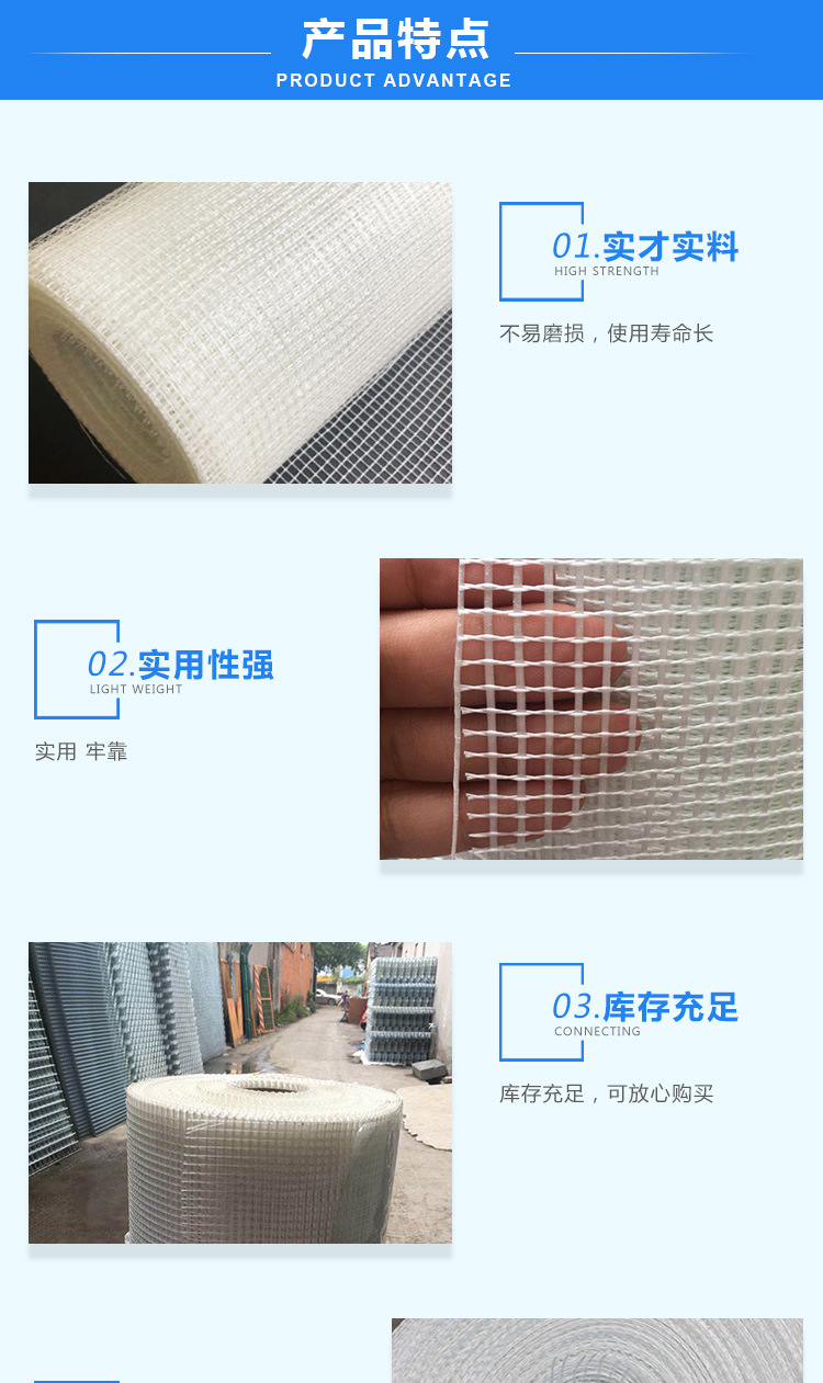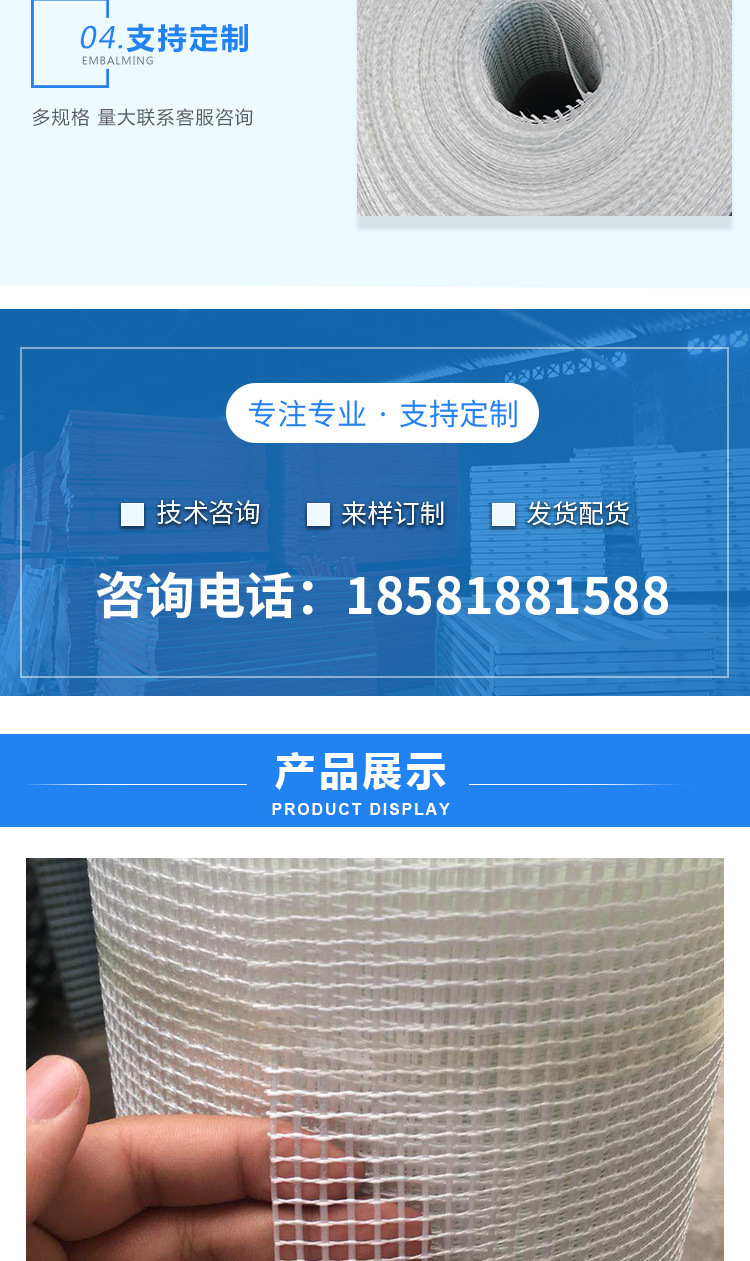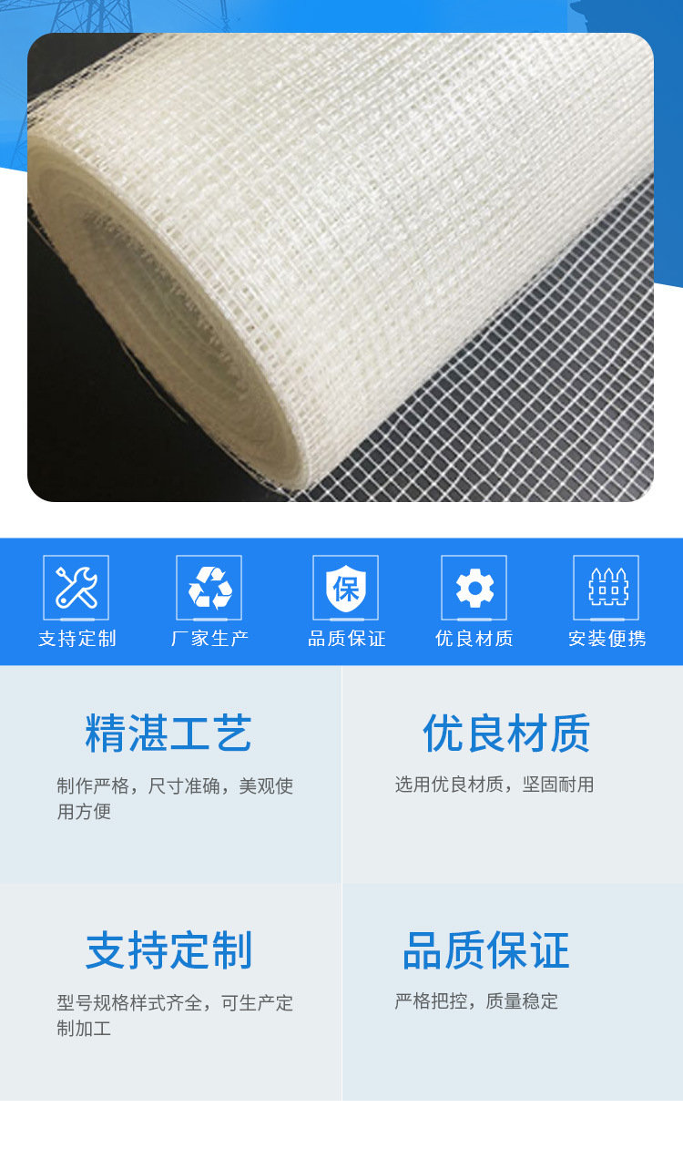网格布是以中碱或无碱玻纤维纱织造,经耐碱高分子乳液涂覆的玻纤。网格布系列产品:耐碱GRC玻纤网格布,耐碱墙体专用网片及石材网格布,大理石背贴网格布。主要用途被广泛应用在:1) 墙体增强材料上(如玻纤墙体网布、GRC墙板、EPS内外墙保温板、石膏板等。2) 增强水泥制品(如罗马柱、烟道等)。3) 花岗岩、马赛克专用网片、大理石背贴网。4) 防水卷材布、沥青屋面防水。5) 增强塑料、橡胶制品的骨架材料。6) 防火板。7) 砂轮基布。8) 公路路面用土工格栅。9) 建筑用嵌缝带等等。