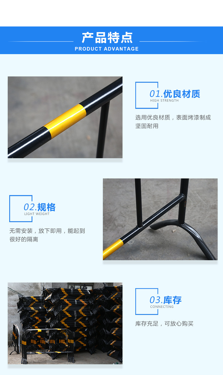 主要采用可拆接构件将护栏主片与底座或防护柱进行标准连接,等特定需要的时候可轻松拆除,进行移动安装。主要构造特点:网片比较小巧,底座安全性能强,造型美观,可根据客户需要定做生产。
