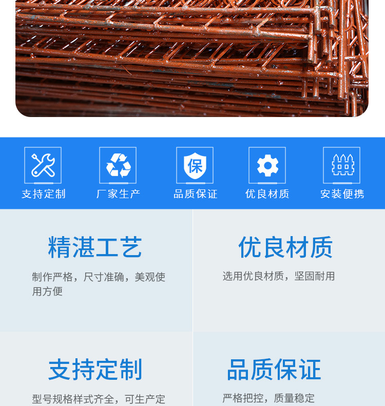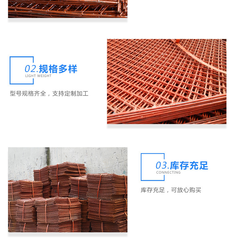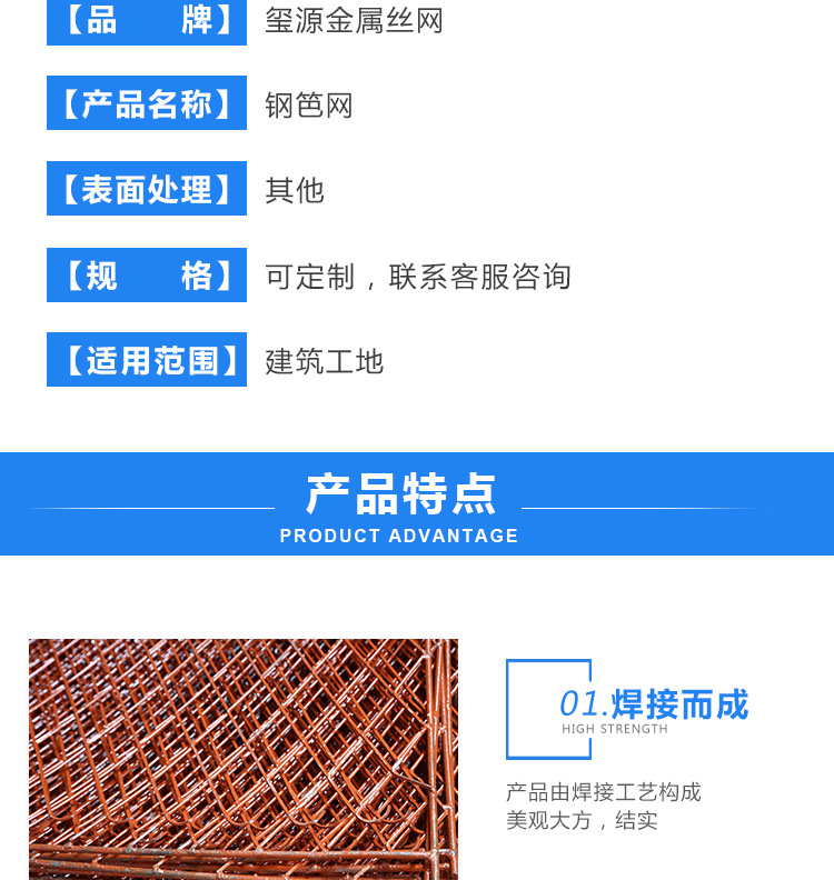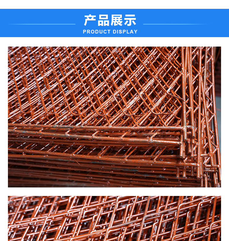 承载重力大:每块大小约一平方米左右的钢笆网片可承载800公斤以上重力。抗拉强度大:网面结构坚固,冲压型生产工艺,表面无焊接点,每延米可抗100KN拉力。表面防滑、耐磨:波浪形平整网片,具有很好的防滑、耐磨效果。重复利用率高:钢笆网片不易变形、损坏,每块可重复利用五次以上。