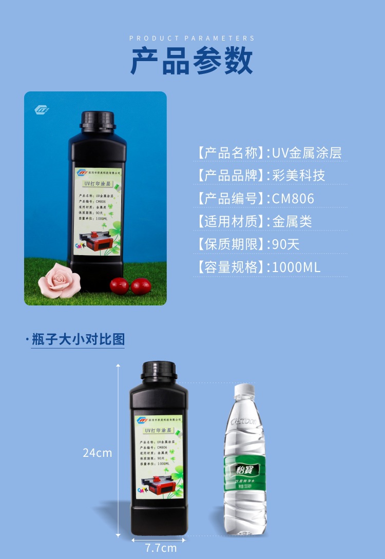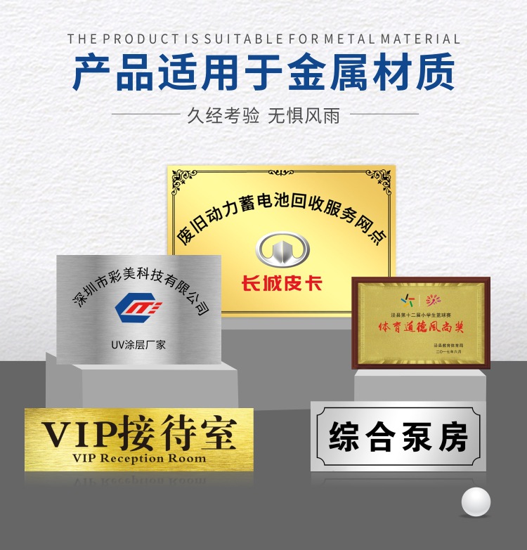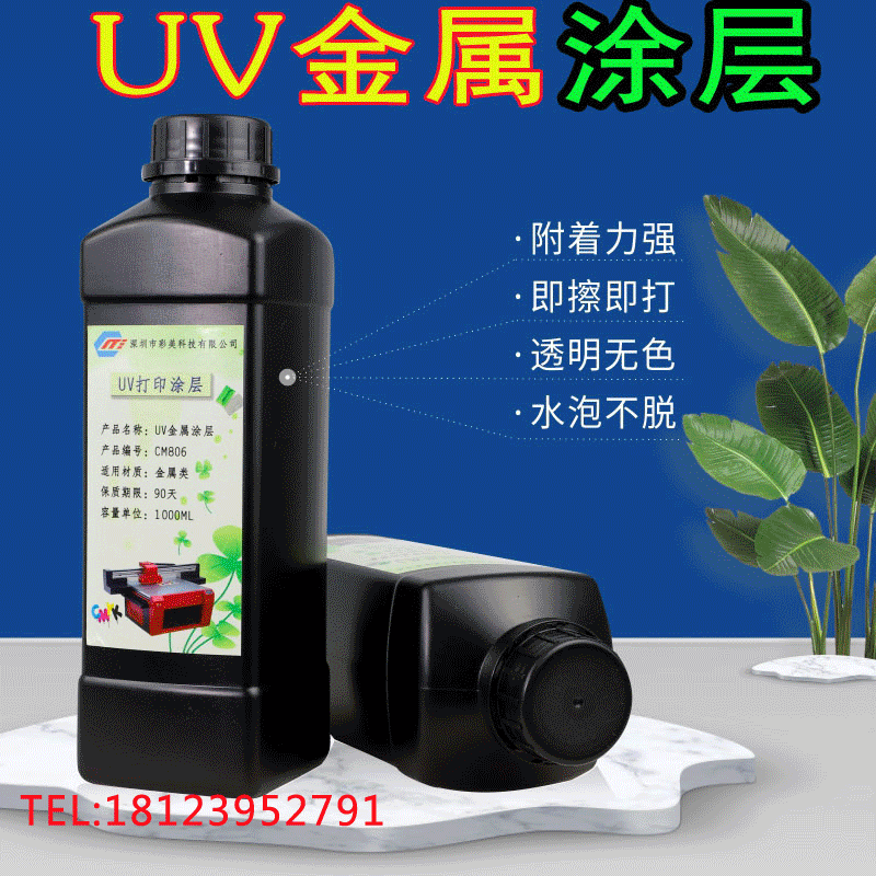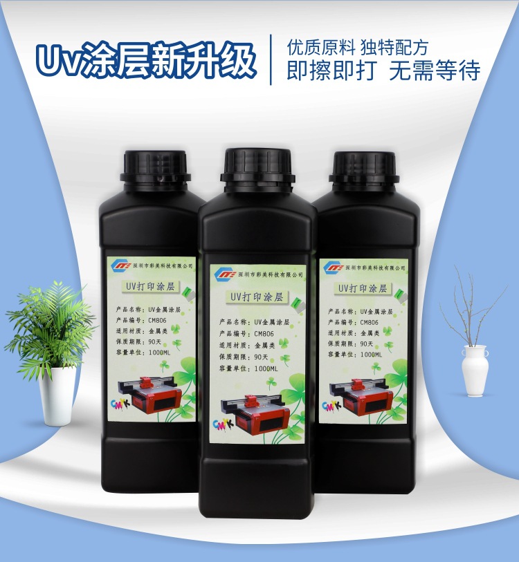 此涂层只适用于安装LED紫外灯或汞灯之平板打印机,适用于光固化墨水之底涂涂层,可用在铜,铁,铝,马口铁,铝型材等金属底材上,以增加UV墨水的附着力,耐水,耐溶剂性。本产品为紫外光固化涂层,无需烘烤,可以跟UV墨水同步固化。具有优异的快干性,极大的提高了生产效率。