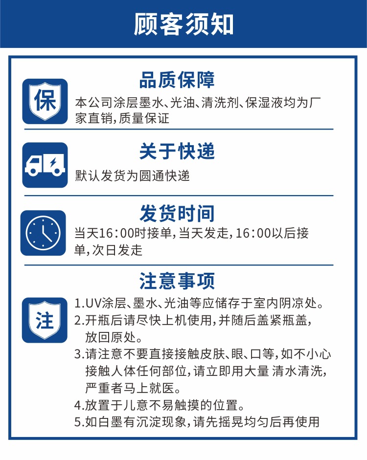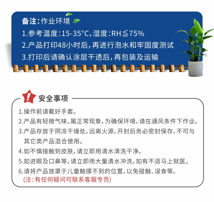5,UV墨水的耐水性随时间的增加而增强,建议1周后进行浸泡实验。耐水性在长期潮湿的环境下会减弱,但再次完全干燥仍会恢复。