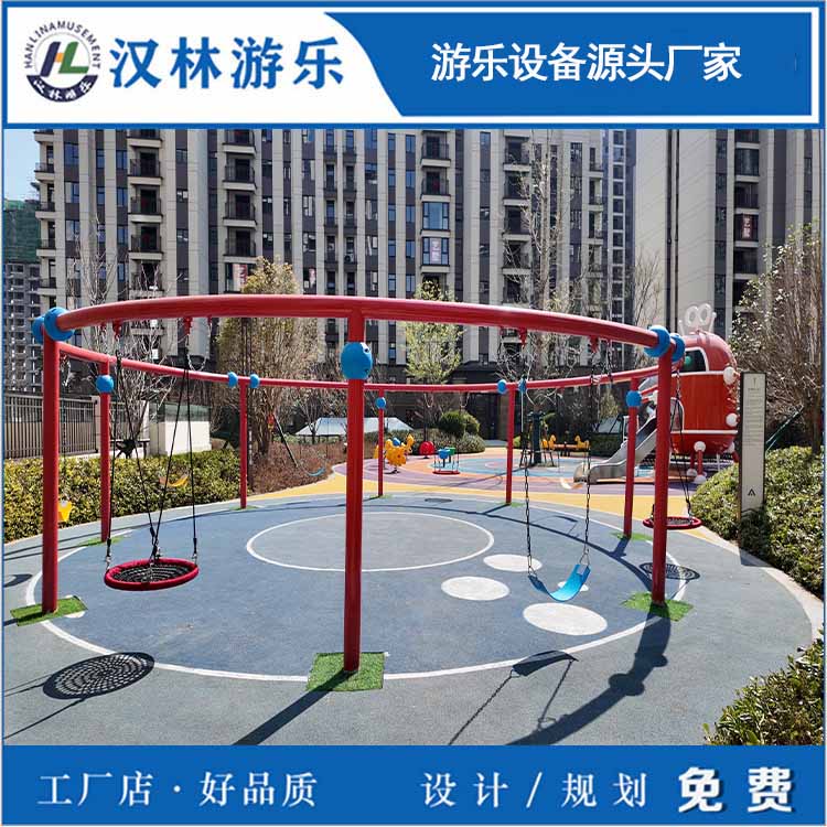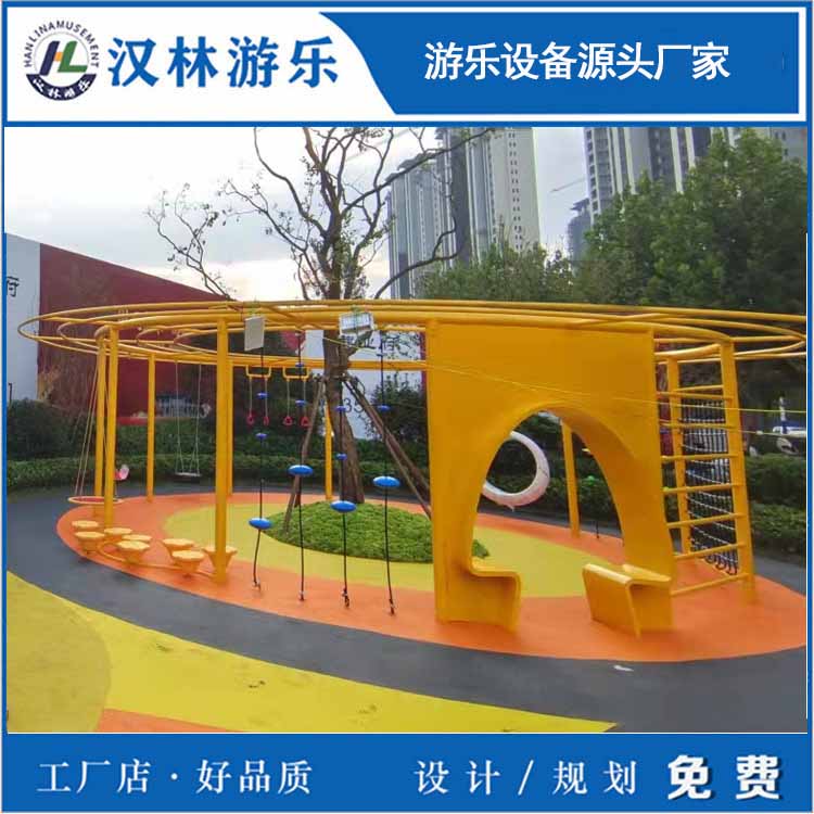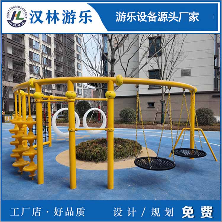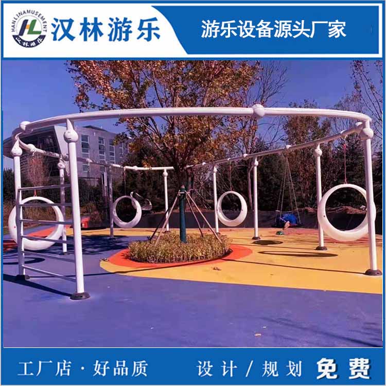这款环形秋千,可塑性强,可添加攀爬绳、攀爬网、绳网盘、发光吊环座椅、秋千等,供多人玩耍,更具有互动性和趣味性。汉林游乐是无动力游乐设备生产厂家,主要生产无动力亲子乐园设备、室内儿童淘气堡、地产非标定制游乐设备、幼教体育设施、丛林探险设备等,从设计到生产再到安装一站式服务。