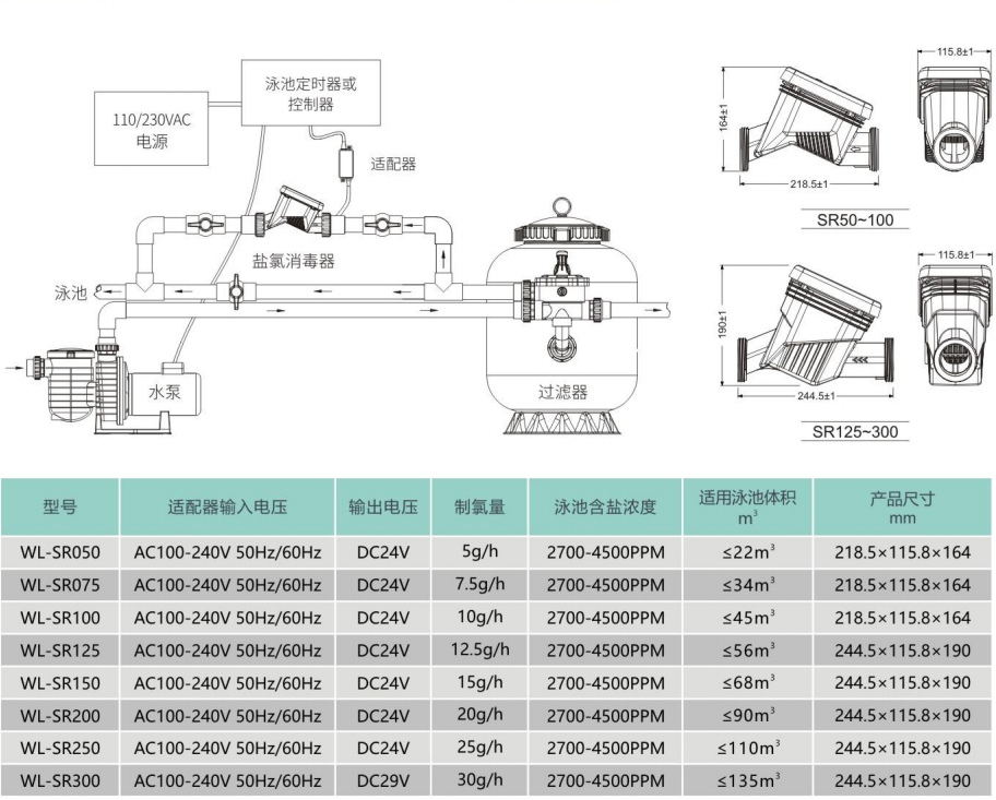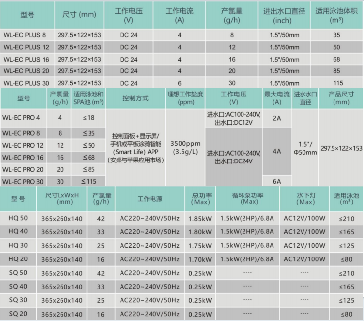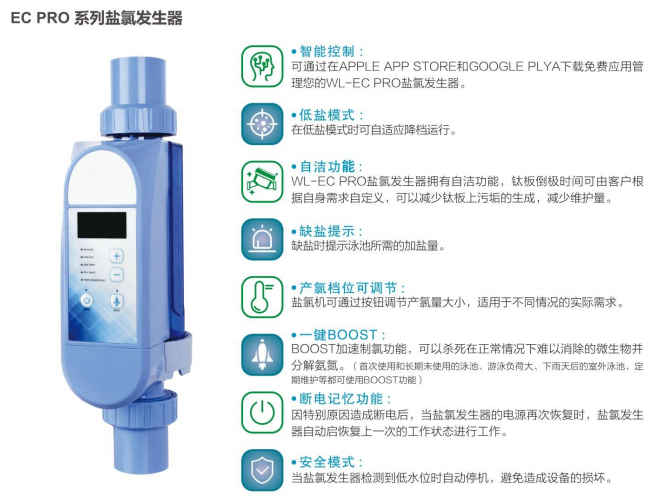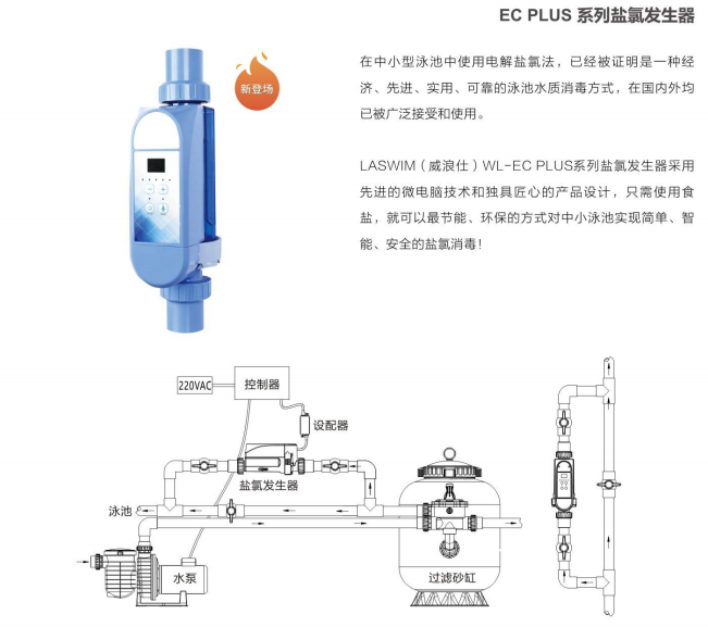 LASWIM(威浪仕)WL-EC PLUS系列盐氯发生器采用先进的微电脑技术和独具匠心的产品设计,只需使用,就可以最节能、环保的方式对中小泳池实现简单、智能、安全的盐氯消毒!