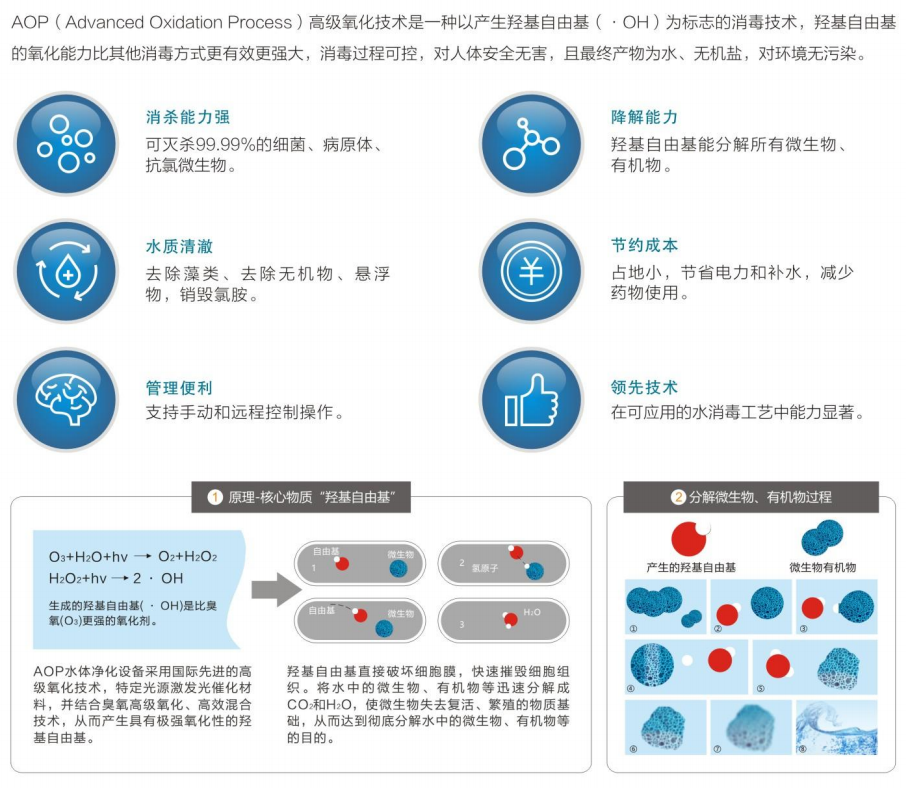 AOP(Advanced Oxidation Process)高级氧化技术是一种以产生羟基自由基(·OH)为标志的消毒技术,羟基自由基的氧化能力比其他消毒方式更有效更强大,消毒过程可控,对人体安全无害,且最终产物为水、无机盐,对环境无污染。