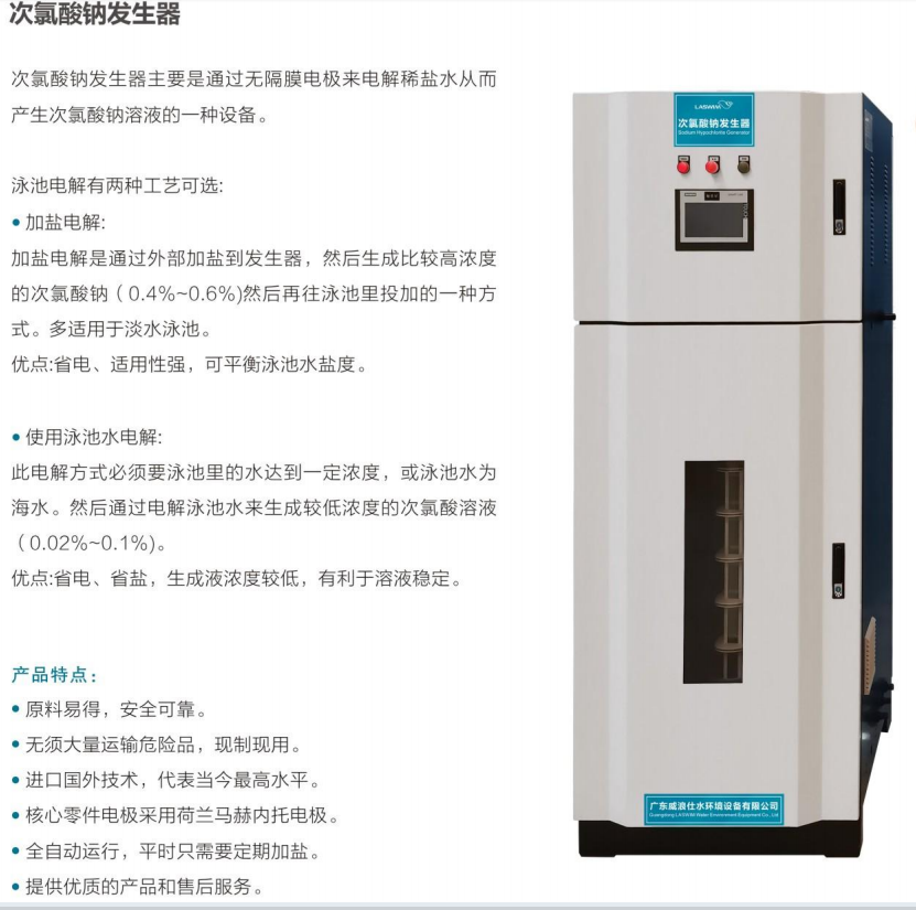 加盐电解是通过外部加盐到发生器,然后生成比较高浓度的次(0.4%~0.6%)然后再往泳池里投加的一种方式。多适用于淡水泳池。