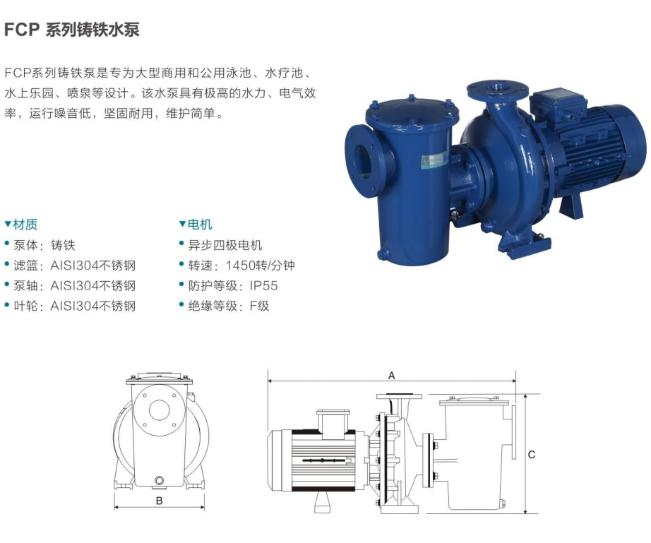 FCP系列铸铁泵是专为大型商用和公用泳池、水疗池、水上乐园、喷泉等设计。该水泵具有高的水力、电气效率,运行噪音低,坚固耐用,维护简单。