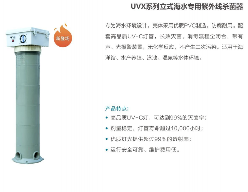 专为海水环境设计,壳体采用PVC制造,防腐耐用。配套高品质UV-C灯管,长效灭菌。消毒流程全闭合,带有声、光报警装置,无化学反应,不产生二次污染。适用于海洋馆、水产养殖、泳池、温泉等水体环境。
