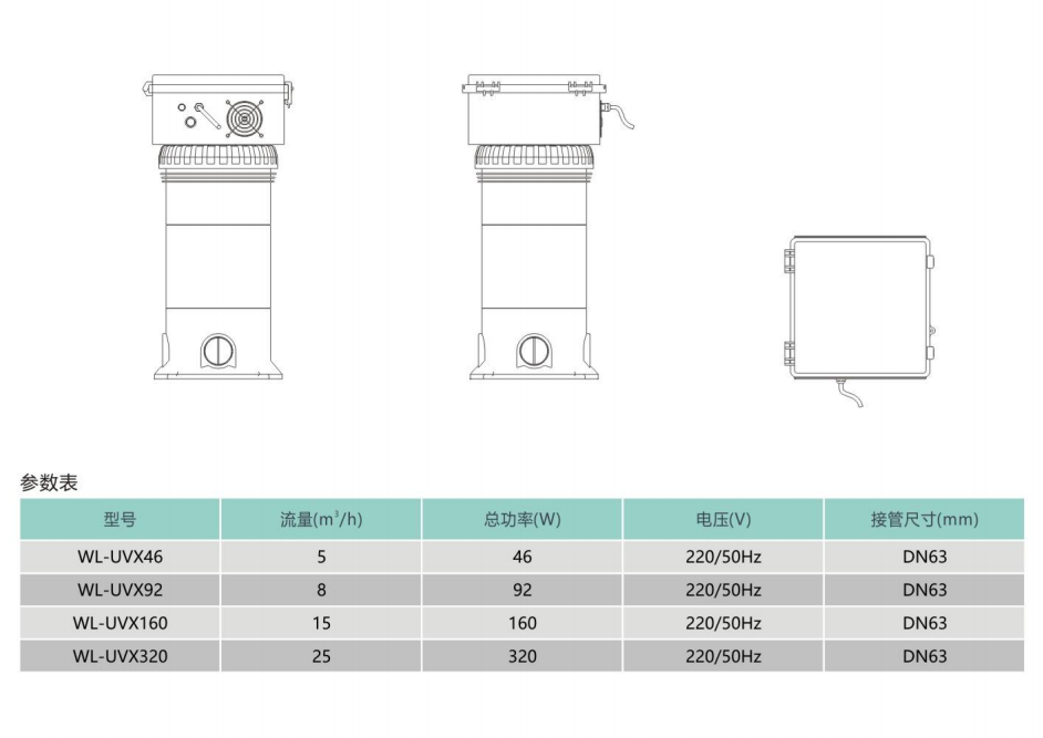 壳体材质为PVC,内胆采用不锈钢制造,机械抛光和钝化,防腐耐用。配套高品质UV灯管,长效灭菌。消毒流程全闭合,无化学反应,不产生二次污染。适用于海洋馆、水产养殖、泳池、温泉等水体环境。