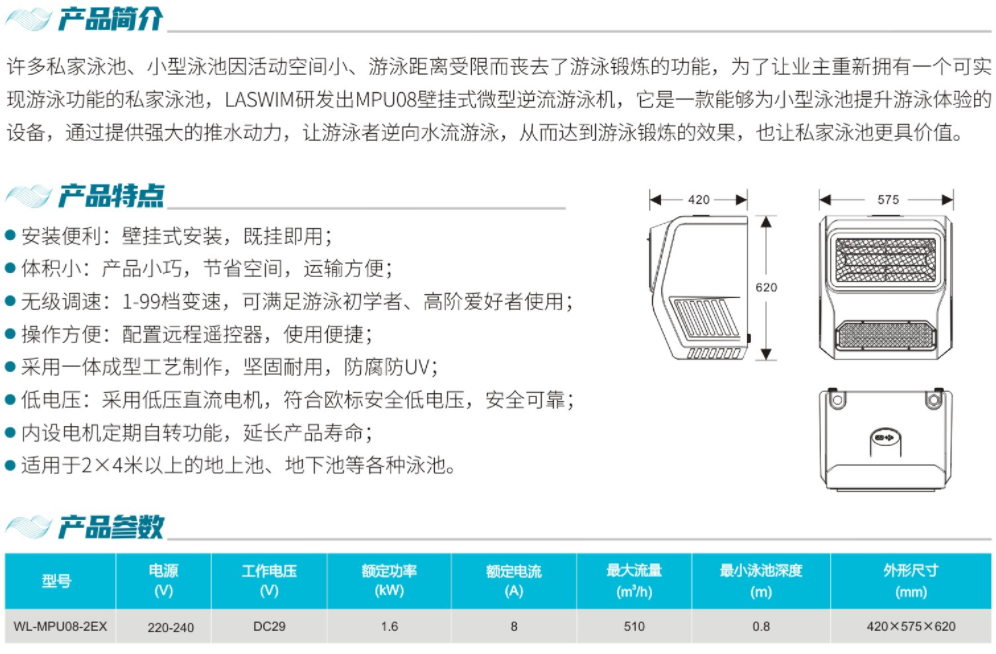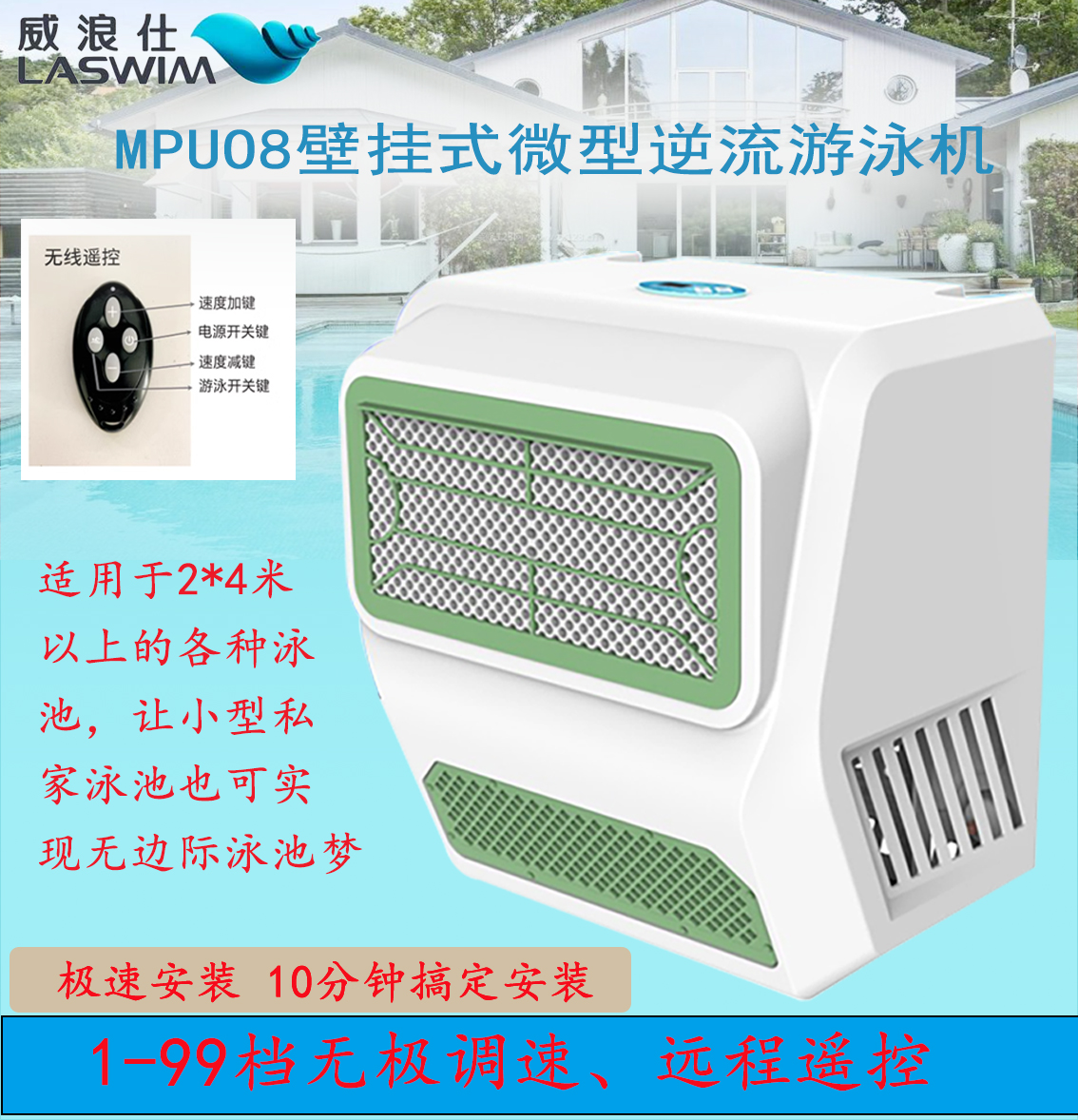 许多私家泳池、小型泳池因活动空间小、游泳距离受限而丧去了游泳锻炼的功能,为了让业主重新拥有一个可实现游泳功能的私家泳池,LASWIM研发出MPU08壁挂式微型逆流游泳机,它是一款能够为小型泳池提升游泳体验的设备,通过提供大的推水动力,让游泳者逆向水流游泳,从而达到游泳锻炼的效果,也让私家泳池更具价值。