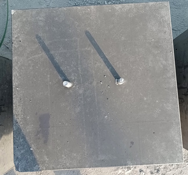 将螺杆的一端折弯,弯的一端埋入水泥墩,另一端超出墩子顶部两到三公分即可,两根螺杆之间间距为10公分。