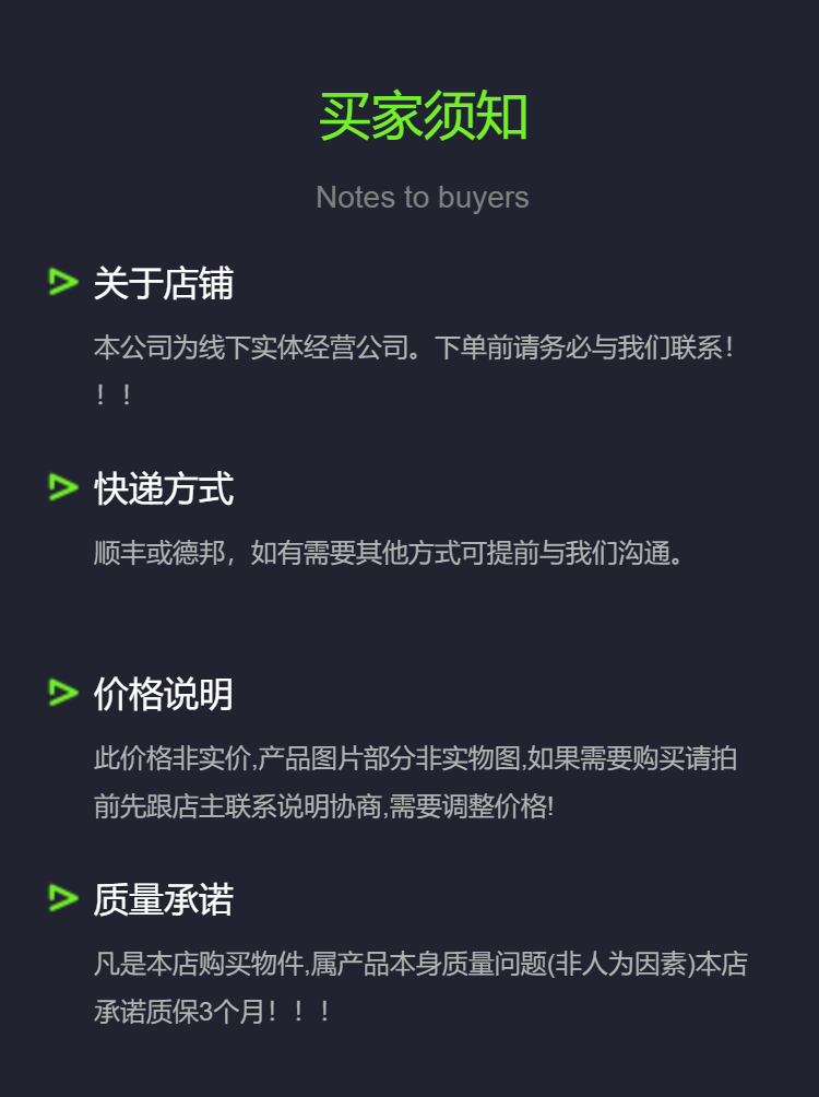 本店销售的产品一律保证质量.价格非实价!请客户下单前询问客服再下单,谢谢.承诺在答应的期限之内发货,快递 默认顺丰!自签收起7日内发现商品存在质量问题的,我们负责退换!
