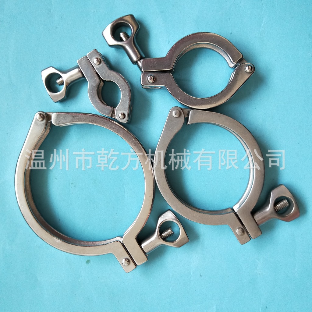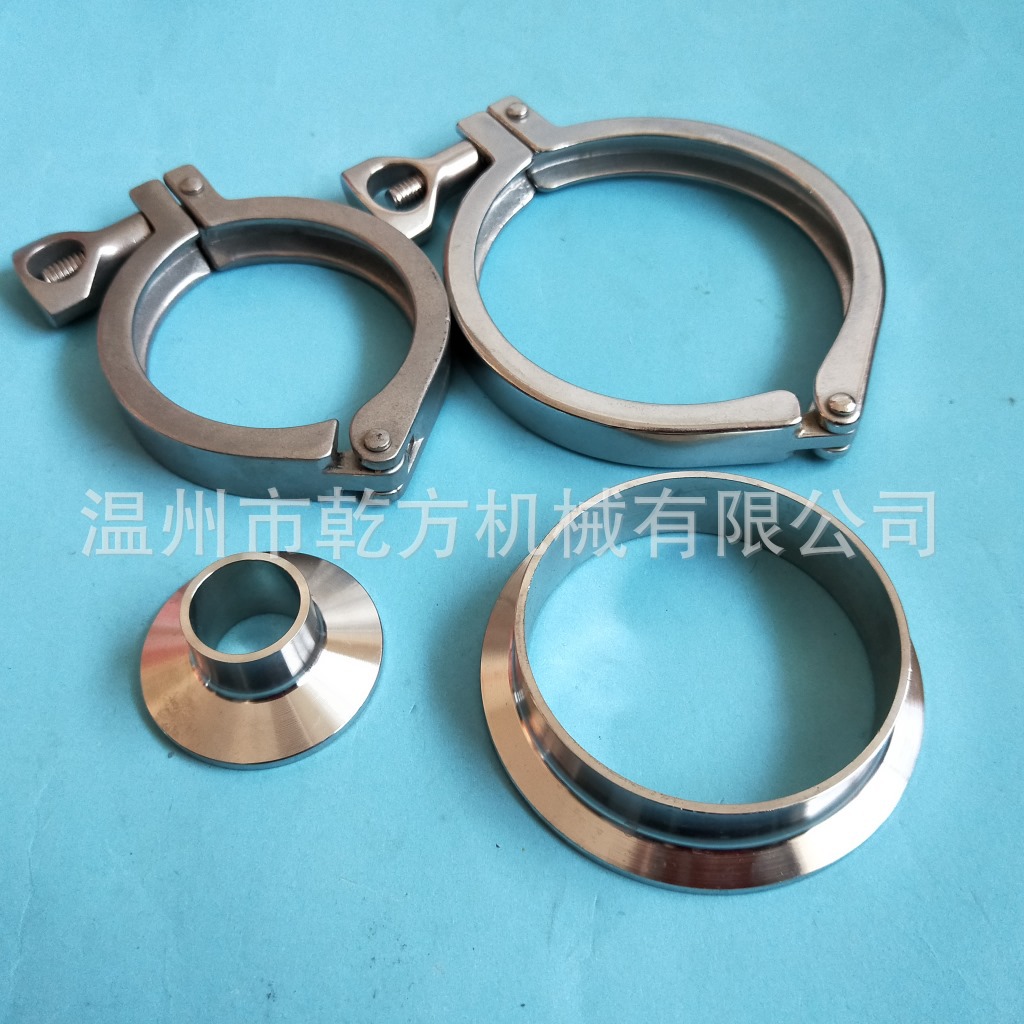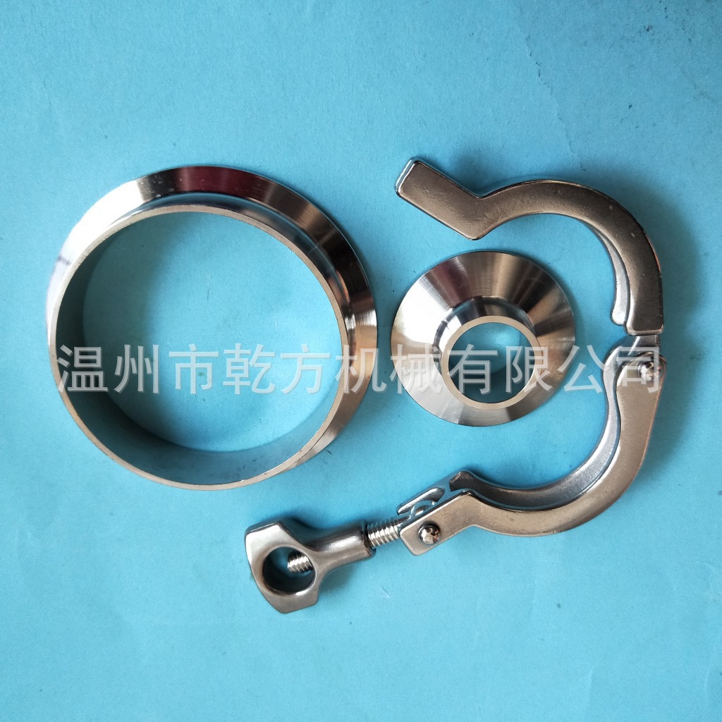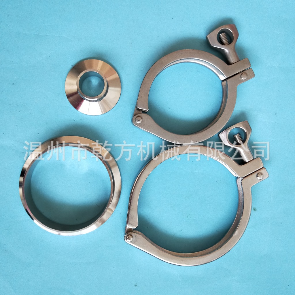 不锈钢卫生级卡箍接头套装,也叫快装接头、端头、卡盘、管接头;卡箍、接头都是管道配件的一种(一整套包括:两个快装接头、一个精铸卡箍和一个硅胶垫片)。其主要性能是快速连接,安装方便,为工程带来便利。我们常见的卡箍有不锈钢精铸卡箍、冲压卡箍、高压卡箍等。常见的接头有快装接头、活接头(也被称为由任),螺纹接头(螺纹接头分为外螺纹和内螺纹)。卡盘也被称为卡箍接头,其为卡箍配套设备配件,同硅胶密封垫是同一套配件。