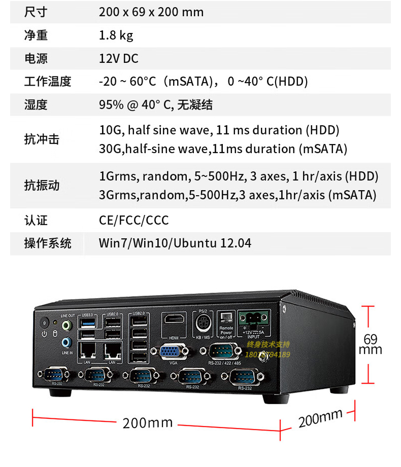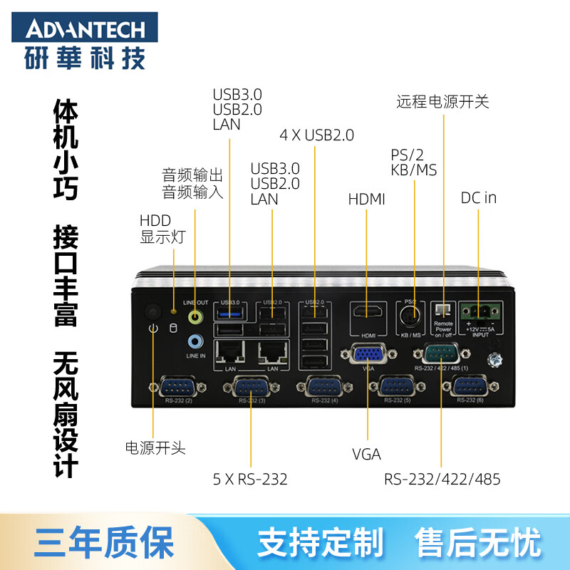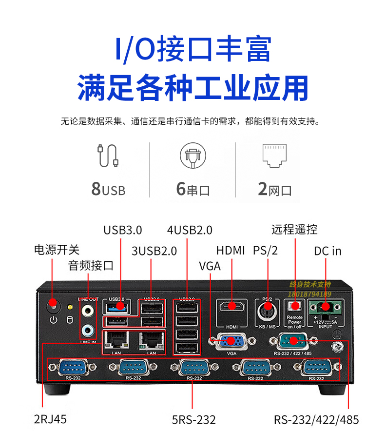 -VGA,HAMI.2个Gbe LAN,7个USB 2.0,,1个USB 3.0,5个RS-232,1个RS-232/422/485