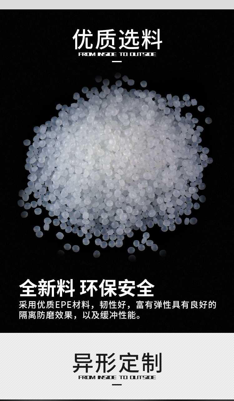 EPE 珍珠棉 ,是一种新型环保的包装材料。它由低密度聚乙烯脂经物理发泡产生无数的独立气泡构成。克服了普通发泡胶易碎、变形、恢复性差的缺点。具有隔水防潮、防震、隔音、保温、可塑性能佳、韧性强、循环再造、环保、抗撞力强等诸多优点,亦具有很好的抗化学性能。是传统包装材料的理想代替品。