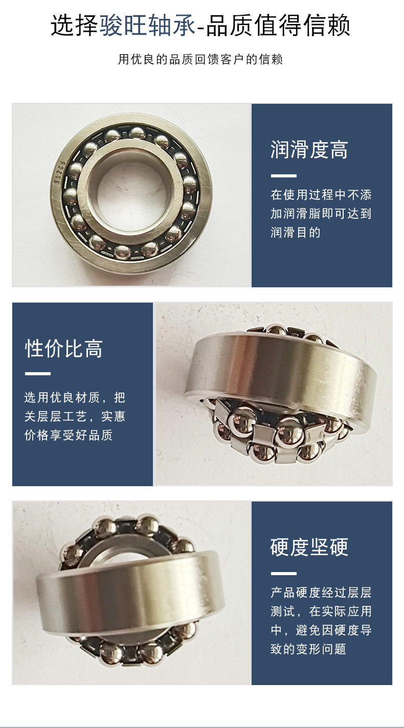 调心球轴承有圆柱孔和圆锥孔两种结构,保持架的材质有钢板、合成树脂等。其特点是外圈滚道呈球面形,具有自动调心性,可以补偿不同心度和轴挠度造成的误差,但其内、外圈相对倾斜度不得超过3度。