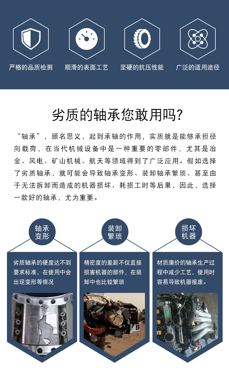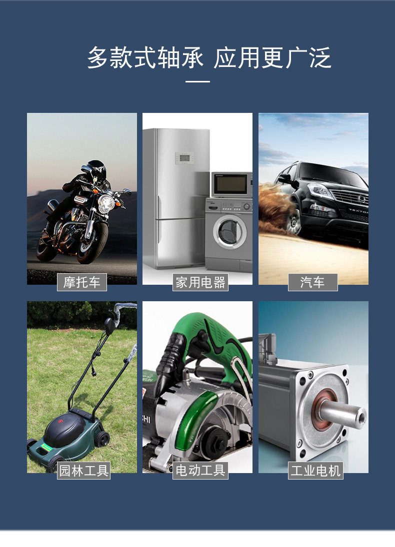 调心球轴承适用于承受重载荷与冲击载荷、精密仪表、低噪音电机、汽车、摩托车、冶金、轧机、矿山、石油、造纸、水泥、榨糖等行业及一般机械等