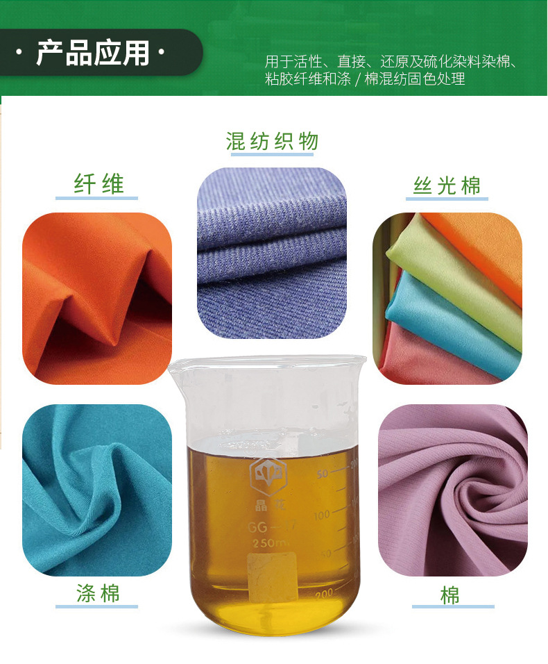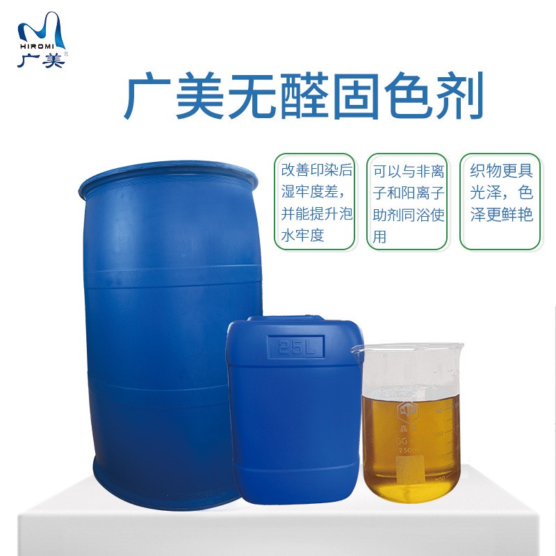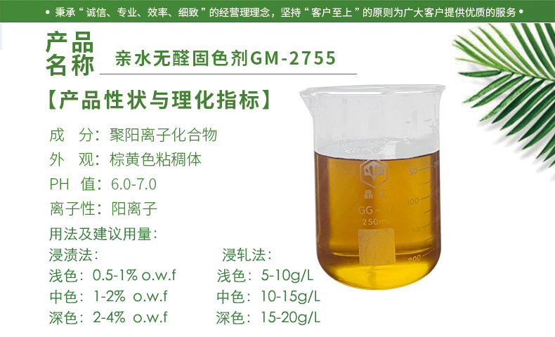 无醛固色剂GM-2755是乙希胺基环氧缩合物,适用于活性染料和直接染料的固色,能提高湿牢度和摩擦牢度;不影响日晒牢度;不会使被处理织物手感发硬;对色光影响小。