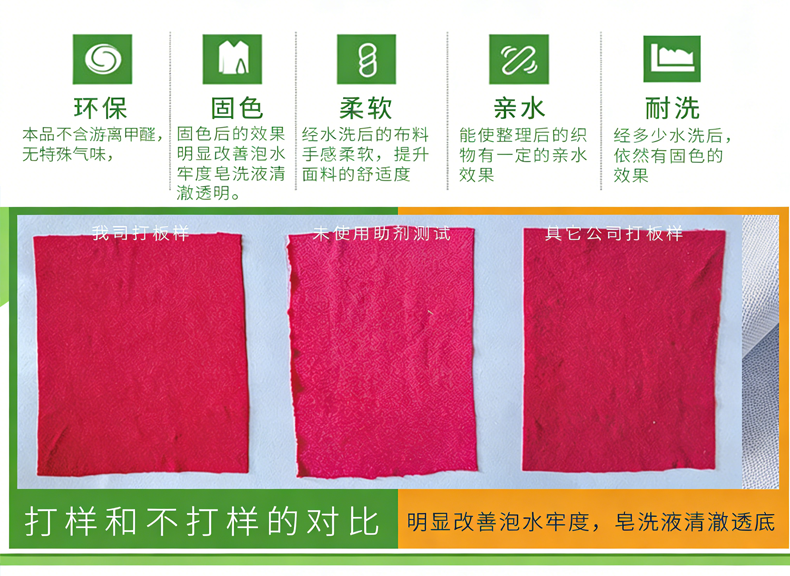 GM-2755能显著提高活性染料、硫化染料、直接染料染色后的湿处理牢度(皂洗、熨烫牢度)对摩擦牢度也有一定的提高,且不影响织物的手感。