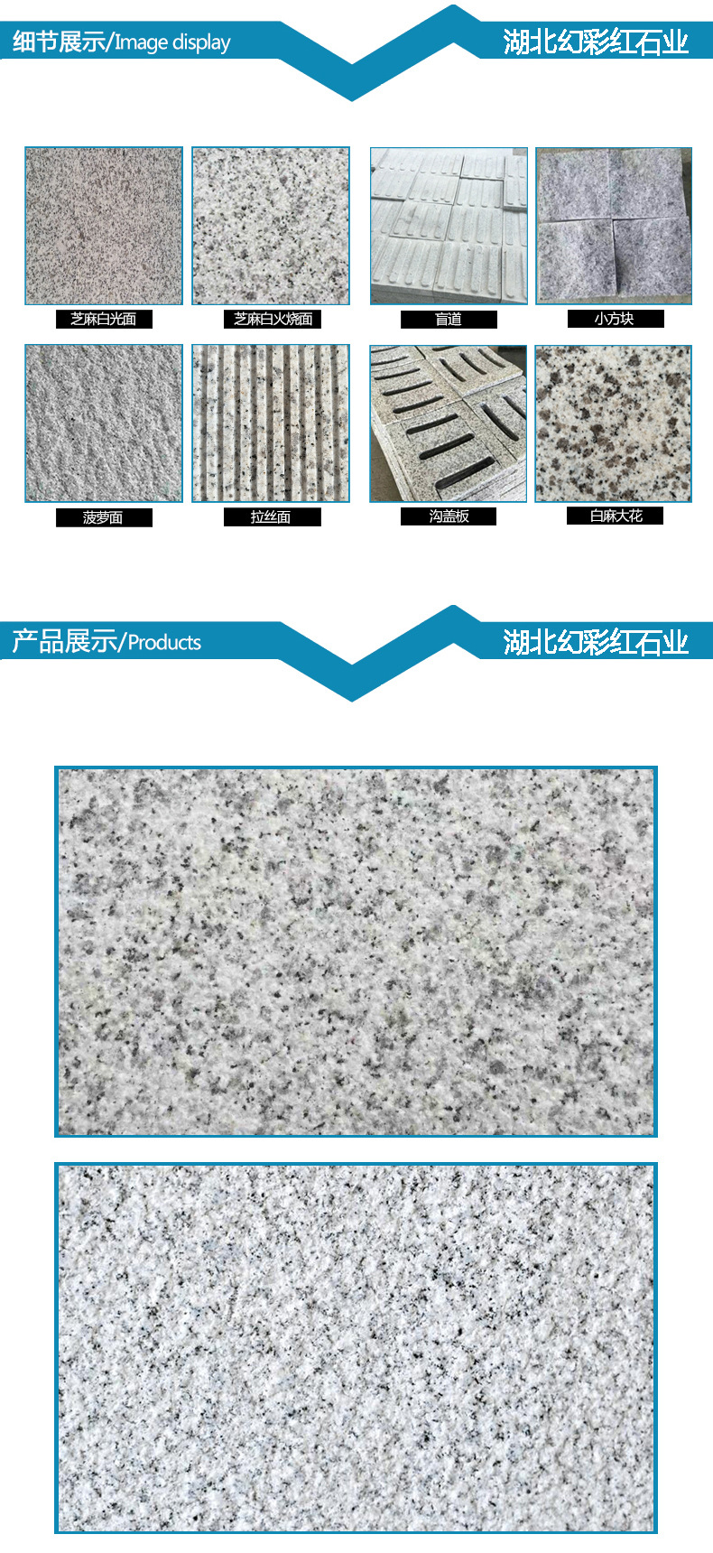 湖北幻彩红石业有限公司是一家集石材矿山开采、石材加工、销售、安装为一体的大型石材企业. 我厂主要石材品种有:芝麻白、芝麻灰、芝麻黑、黄金麻、黄锈石、白麻、灰麻、G603、G654、G655、卡基诺金,深灰麻,卡拉麦里金,黄金钻等系列产品。生产提供:毛光板、工程板、火烧板、盲道板、广场板、干挂板、楼梯踏步、剁斧板、荔枝面、拉丝面、路沿石、异形石材等。提供花色分别有:大花、中花、小花。被广泛用于广场、车站、飞机场、公园、宾馆、酒店、别墅、市政园林工程、陵园公墓等各类建筑墙体、地面、桌面装饰装修。