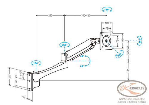 ●双臂组合,采用高强度铝合金材质,屏幕延伸长达620mm;