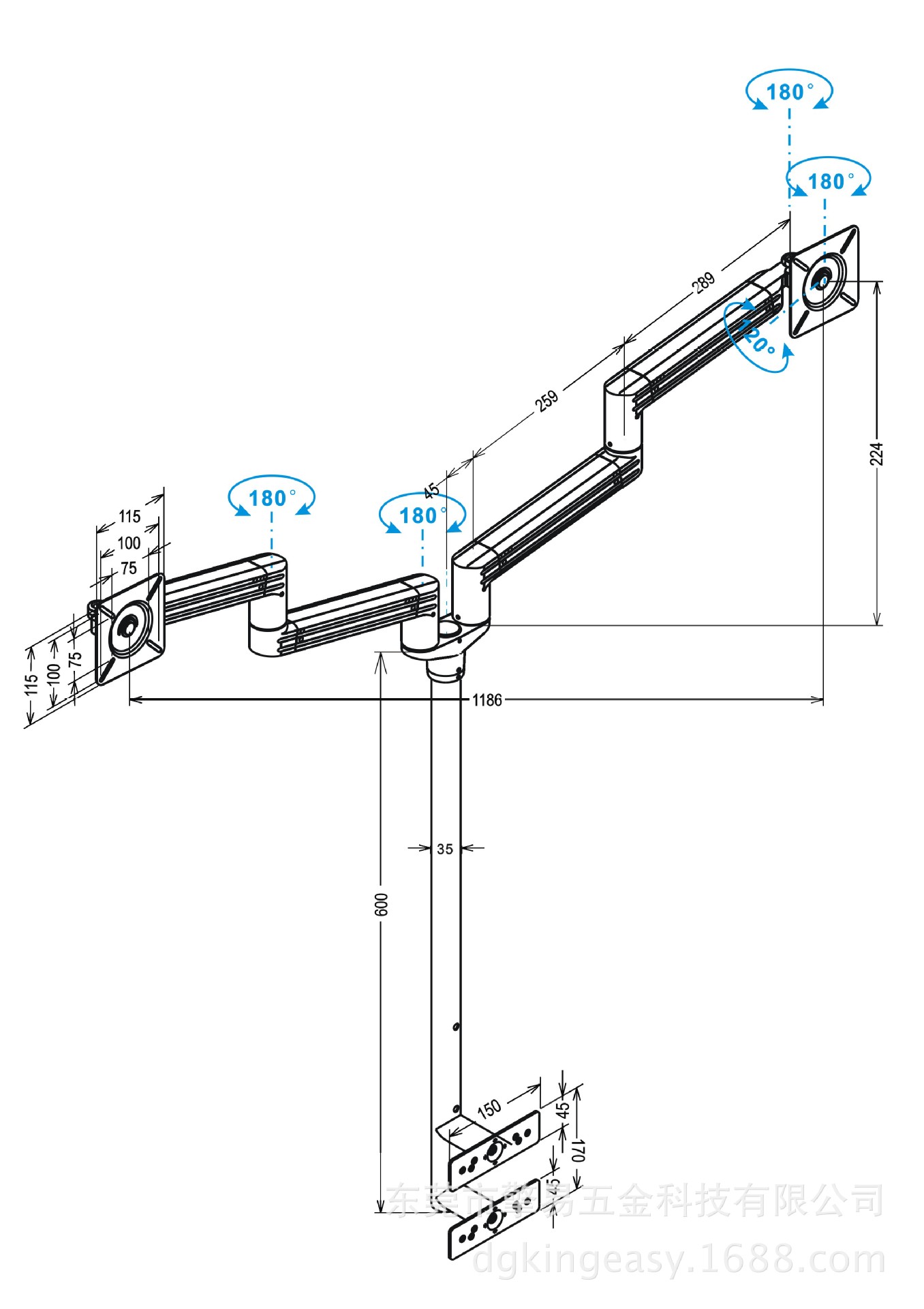 1.全隐藏式理线系统;2.双支臂采用分体结构,方便穿线;3.每个关节均设有限位结构,保证功能的前提下永不绞线;4.显示器支架头特有结构设计,永不会有垂头现象;5.每个旋转关节均有缓冲件,以确保在旋转时不会有异音;6.双支臂结构,可同时安装两台电视。