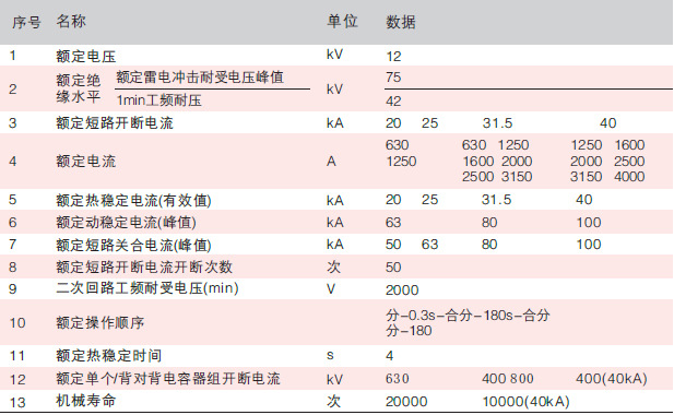 断路器配用中间封接式陶瓷或玻璃真空灭弧室,采用铜铬触头材料,杯状纵磁场触头结构,其触头的电磨损速率小,电寿命长,触头的耐压水平高,介质绝缘强度稳定,弧后恢复速度快,截流水平底,开段能力强。