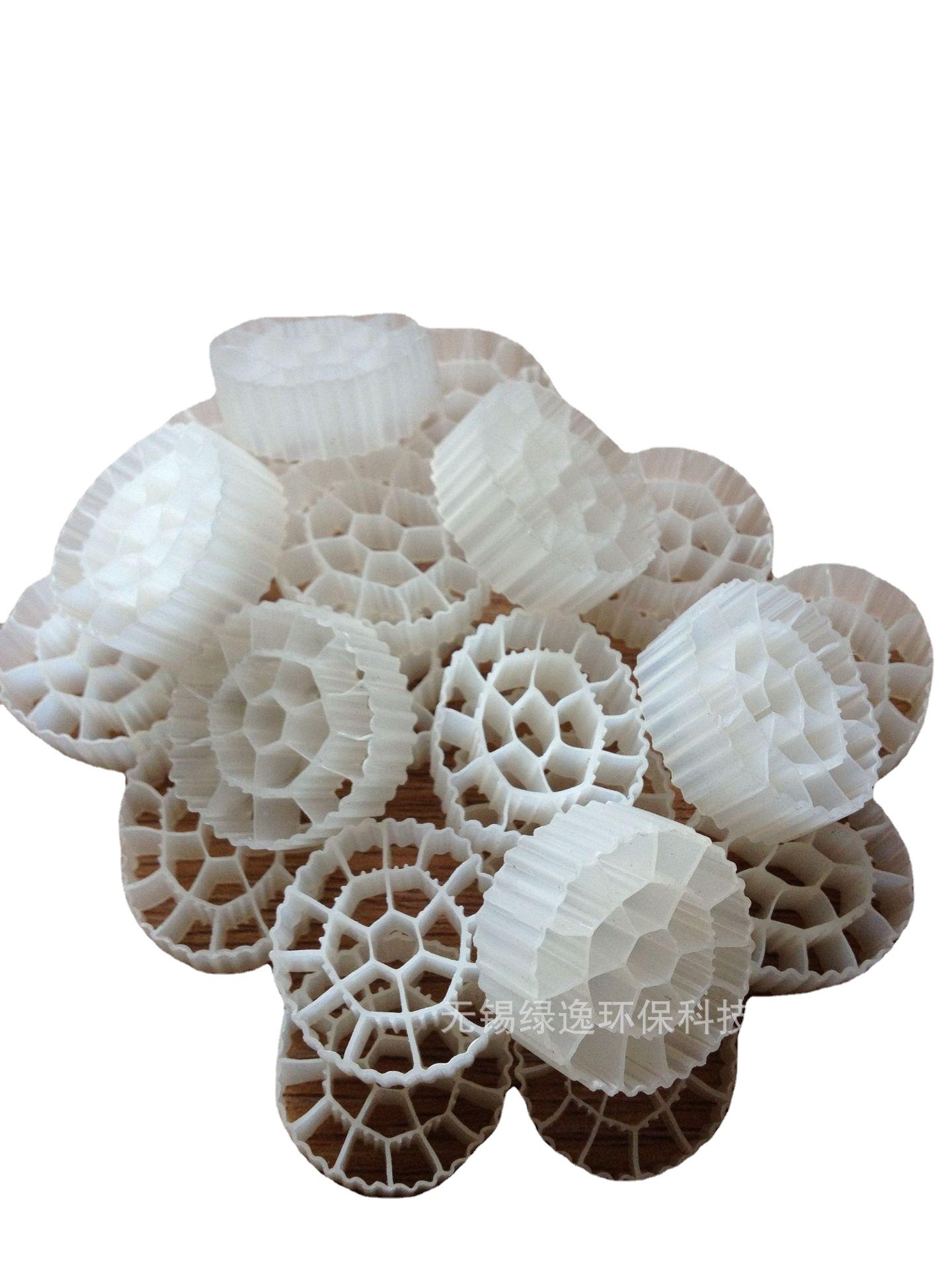 无锡绿逸科技有限公司生产的流化床填料是MBBR工艺 的核心。填料的性能好坏,直接影响到挂膜的难易程度,反应器中生物量的多少,反应器处理效果的好坏。而MBBR 所使用的填料多为聚乙烯或聚丙烯塑料填料,形状似小圆柱体(直径与高约为10250 mm 不等) 。圆柱体有十字支撑,外侧沿不同径向伸展许多尾翅。载体密度略低于水( 0. 9220. 97 g/ cm3 ) , 填料比表面积大( 1602500 m2/ m3) 。表面易于生物膜附着生长,而且巧妙的结构设计使填料在使用时不结团、不堵塞,始终具有理想的空隙率,并具有良好的通气、过水性能。