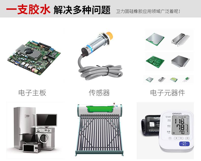 适用于对腐蚀敏感的设备,也适用于室温下无法使用脱酸固化单组份硅胶的场合。如:模块开口密封,线路板组装等。