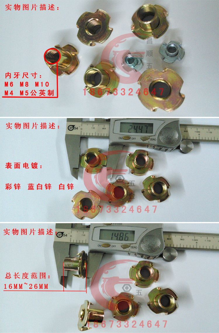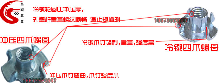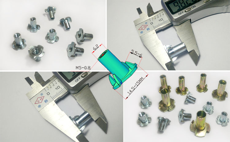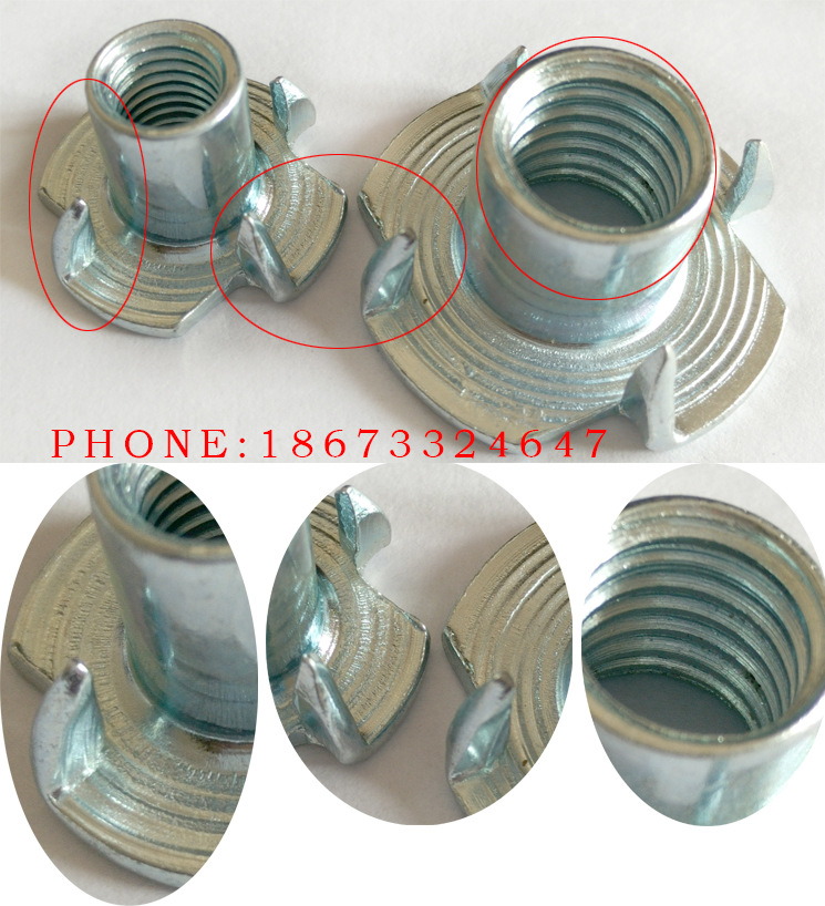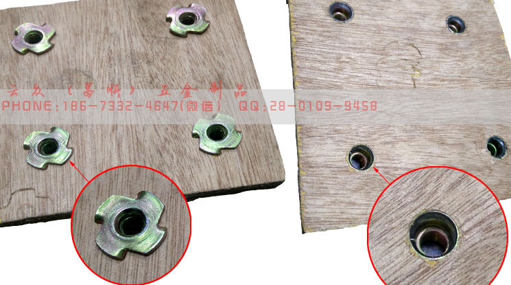 四爪螺母是比一般木板镶嵌螺母更牢固的一种家具螺母之一,四爪对称分布,爪钉有效扣住木板.螺牙M4-M10公英制。四爪螺母广泛应用于家私安装上.特别是沙发上.在安装时由于各种原因会使螺母打转,产生安装困难.四爪螺母通过爪钉固定在木板上,有效解决旧款螺母的缺陷.