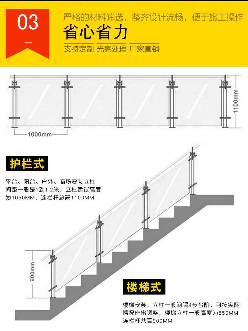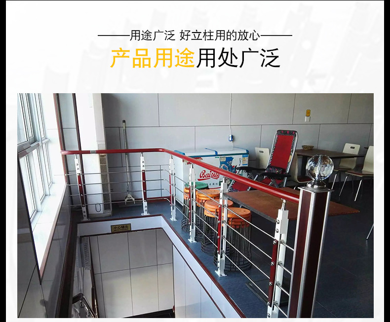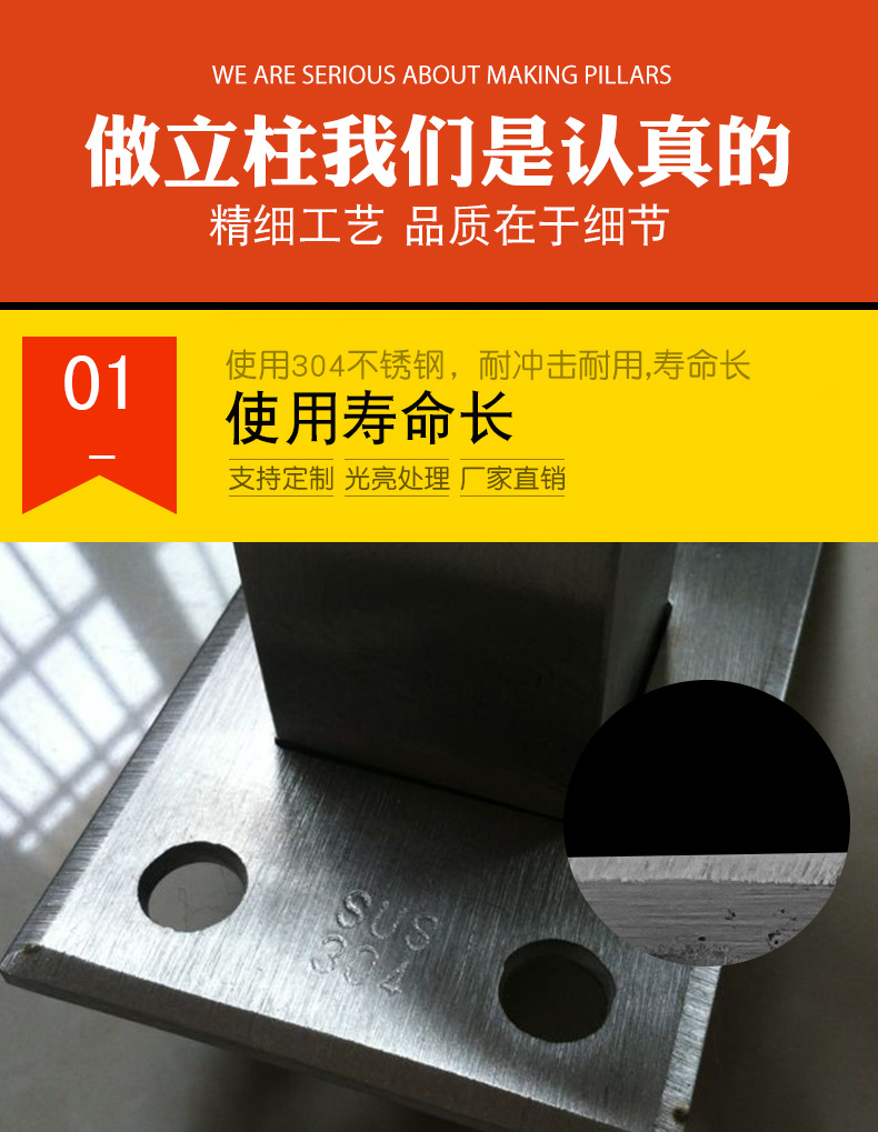 用途不锈钢立柱主要作为栏杆扶手的支撑柱。通过焊接或紧固螺丝与扶手面管进行固定,主要用作不锈钢楼梯扶手、阳台护栏、通道栏杆等栏杆扶手的支撑柱。用于制作立柱的不锈钢,常见的材质一般有:SUS201、SUS304、SUS316、SUS316L等,这些也是装饰领域用得较多的不锈钢材质系列。款式按柱身形状划分: