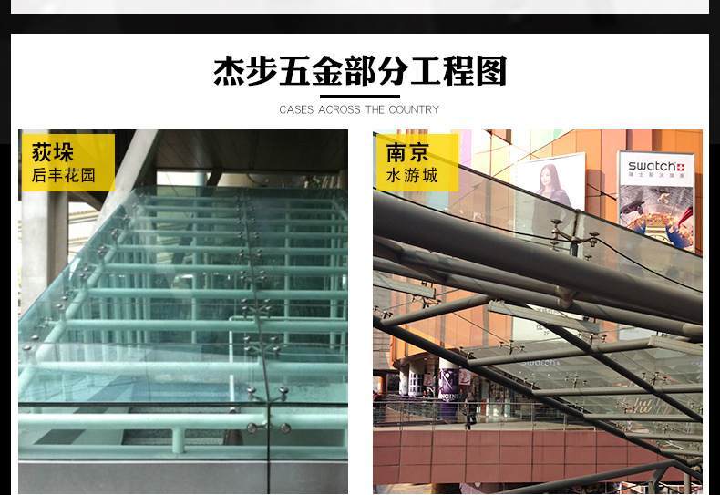 杰步产品驳接爪件,楼梯立柱先后已被国内外诸多工程接受使用,部分工程有:缅甸国家体育馆;新加坡万峰国际酒店;内陆万达广场商铺;泰州火车站;娄底体育馆;扬州火车站;姜堰黄河大酒店;南京新百商场;江阴长江大桥;苏果连锁店;红星美凯龙等等。