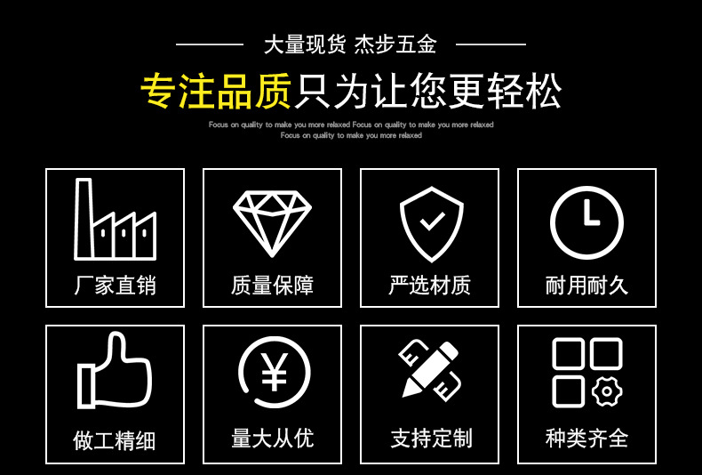 “诚信、敬业、创新”是我们的企业文化,在总经理梅存建的指导下,每一个杰步人都将秉承理念,锐意进取,不断追求自我超越,提升市场竞争力。努力将杰步逐步建设成国内大型的建筑装饰五金配件生产基地。