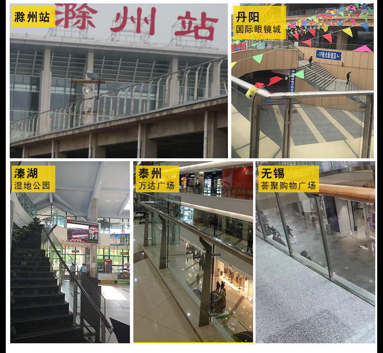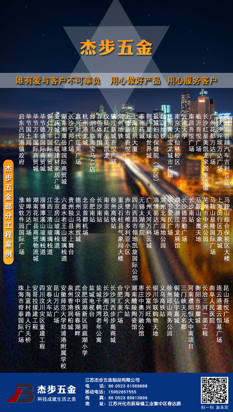 杰步产品驳接爪件,楼梯立柱先后已被国内外诸多工程接受使用,部分工程有:缅甸国家体育馆;新加坡万峰国际酒店;内陆万达广场商铺;泰州火车站;娄底体育馆;扬州火车站;姜堰黄河大酒店;南京新百商场;江阴长江大桥;苏果连锁店;红星美凯龙等等。