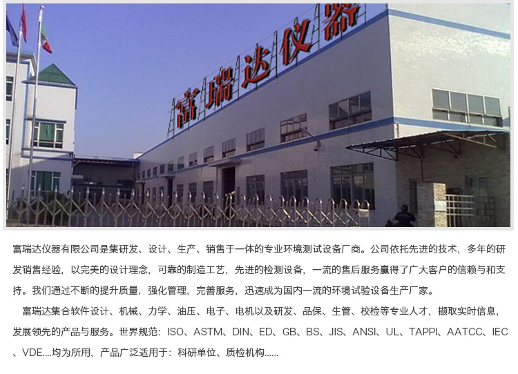 富瑞达仪器有限公司是集研发、设计、生产、销售于一体的环境测试设备厂商。公司依托先进的技术,多年的研发销售经验,以完美的设计理念,可靠的制造工艺,先进的检测设备,的售后服务赢得了广大客户的信赖与和支持。我们通过不断的提升质量,强化管理,完善服务,迅速成为国内的环境试验设备生产厂家。