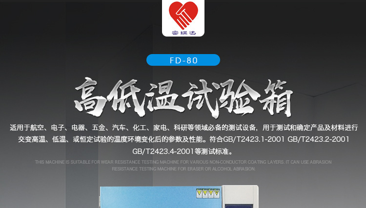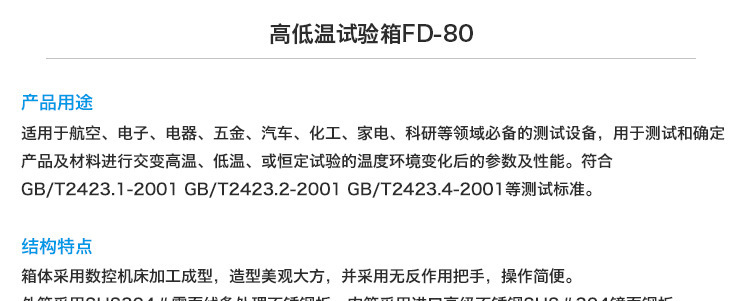 适用于航空、电子、电器、五金、汽车、化工、家电、科研等领域必备的测试设备,用于测试和确定产品及材料进行交变高温、低温、或恒定试验的温度环境变化后的参数及性能。符合GB/T2423.1-2001 GB/T2423.2-2001 GB/T2423.4-2001等测试标准。