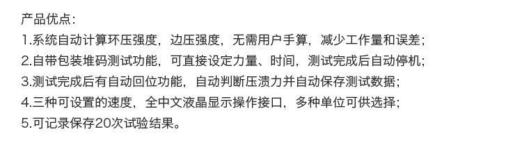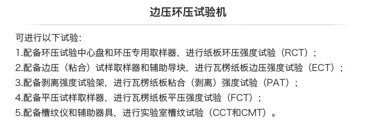 1.配备环压试验中心盘和环压专用取样器,进行纸板环压强度试验(RCT);