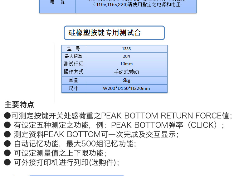 具有精度:±0.2%F.S.、重覆精度:±0.1%F.S.的高精度,並且實現在10Kgf的全刻度,小讀值為0.1gf的1/10000解析度。標準峰值、插拔測試、插拔的壓力峰值、插拔的拉力峰值、抓取接點信號值、設定列表機種類、設定區域的N值等多種機能均可輕易設定。
