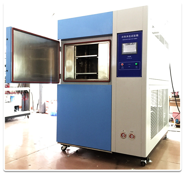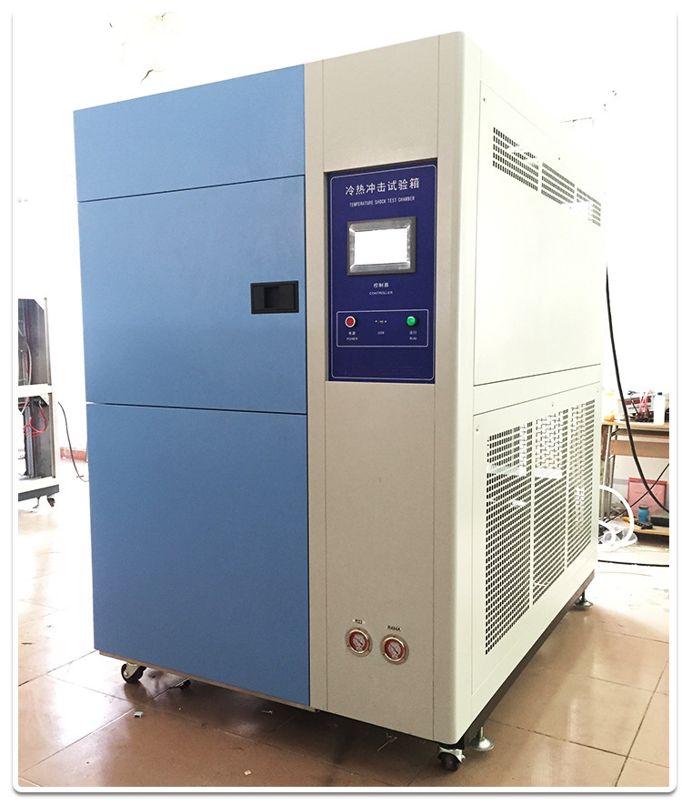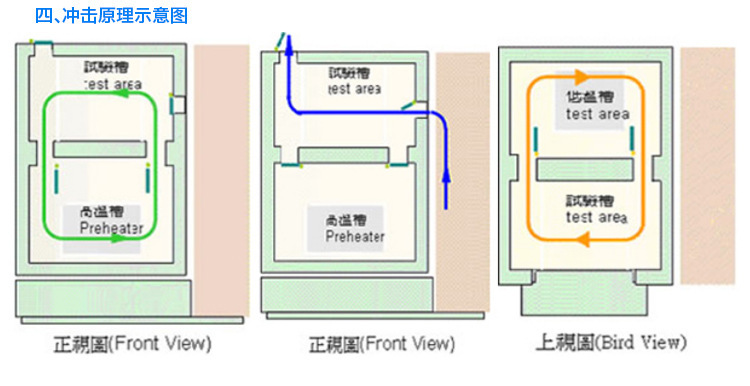 设备分为高温室、低温室、测试室三部分,采独特之断热结构及蓄热蓄冷效果,试验时待测物完全静止,应用冷热风路切换方式将冷、热温度导入测试区实现冷热冲击测试目的。