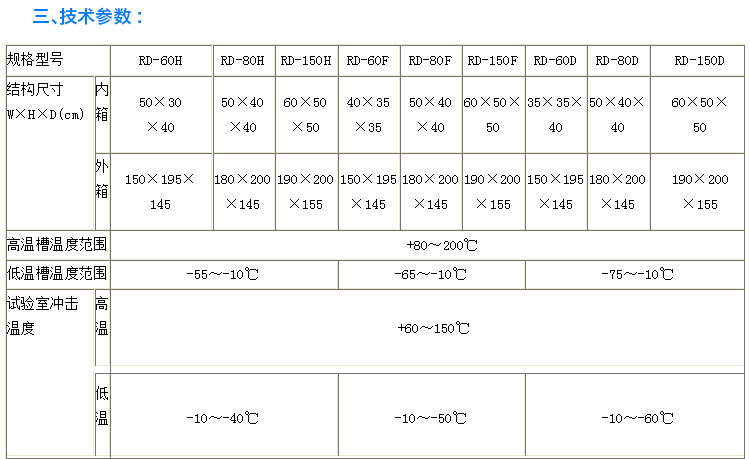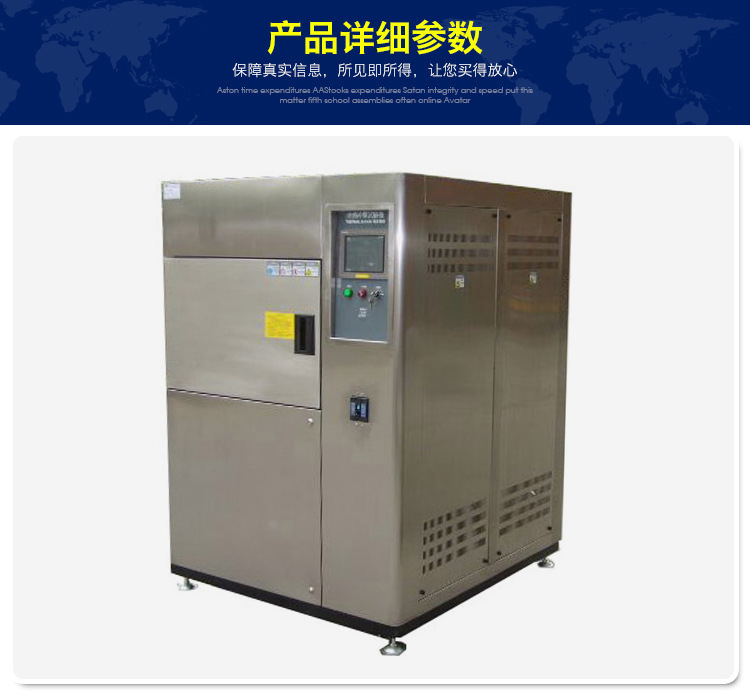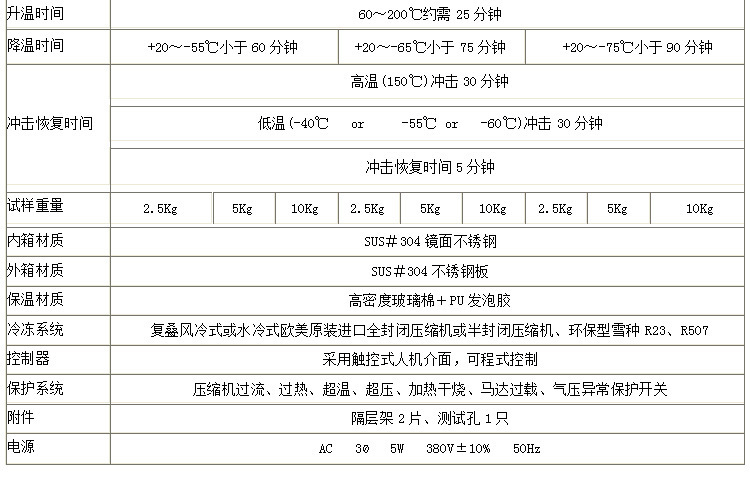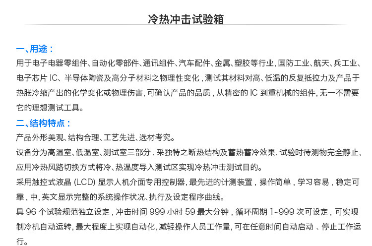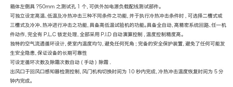 可独立设定高温、低温及冷热冲击三种不同条件之功能,并于执行冷热冲击条件时,可选择二槽式或三槽式及冷冲、热冲进行冲击之功能,具备高低温试验机的功能。具备全自动,高精密系统回路、任一机件动作,完全有P.L.C锁定处理,全部采用P.I.D自动演算控制,温度控制精度高。