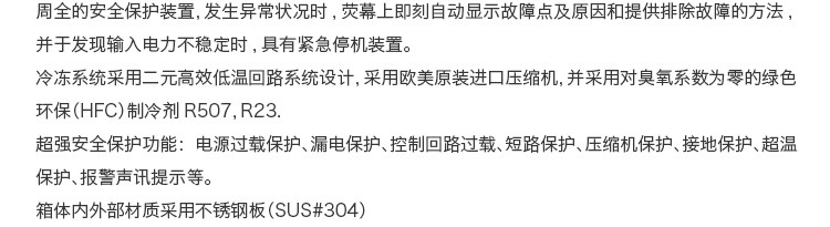 冷冻系统采用二元高效低温回路系统设计,采用欧美原装进口压缩机,并采用对臭氧系数为零的绿色环保(HFC)制冷剂R507,R23.