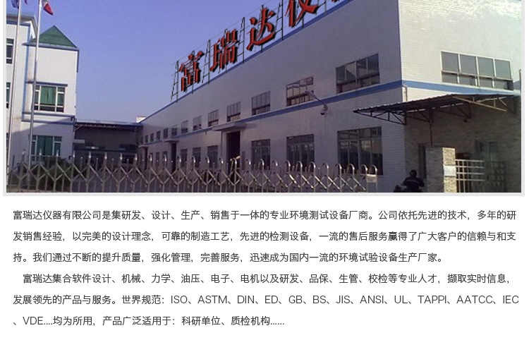 富瑞达仪器有限公司是集研发、设计、生产、销售于一体的环境测试设备厂商。公司依托先进的技术,多年的研发销售经验,以完美的设计理念,可靠的制造工艺,先进的检测设备,的售后服务赢得了广大客户的信赖与和支持。我们通过不断的提升质量,强化管理,完善服务,迅速成为国内的环境试验设备生产厂家。