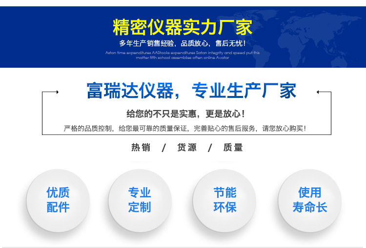 富瑞达集合软件设计、机械、力学、油压、电子、电机以及研发、品保、生管、校检等人才,撷取实时信息,发展的产品与服务。产品广泛适用于:科研单位、质检机构、大专院校以及橡胶、轮胎、塑料、金属、电线电缆、制鞋、皮革、纺织、染整、包装、建材、石化、航空等产业,为材料开发、物性试验、教学研究、质量管理、进料检验不可缺少。