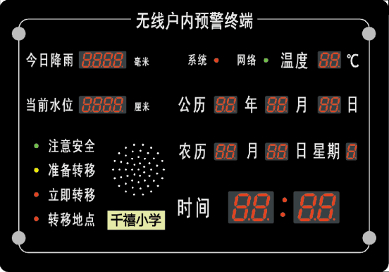 产品采用与家庭日常用品相结合的亲民形式,具有公历、农历、时间、星期、温度等居民日常常用信息的显示功能,可提高居民对设备维护的重视程度,便于居民及时掌握预警信息。