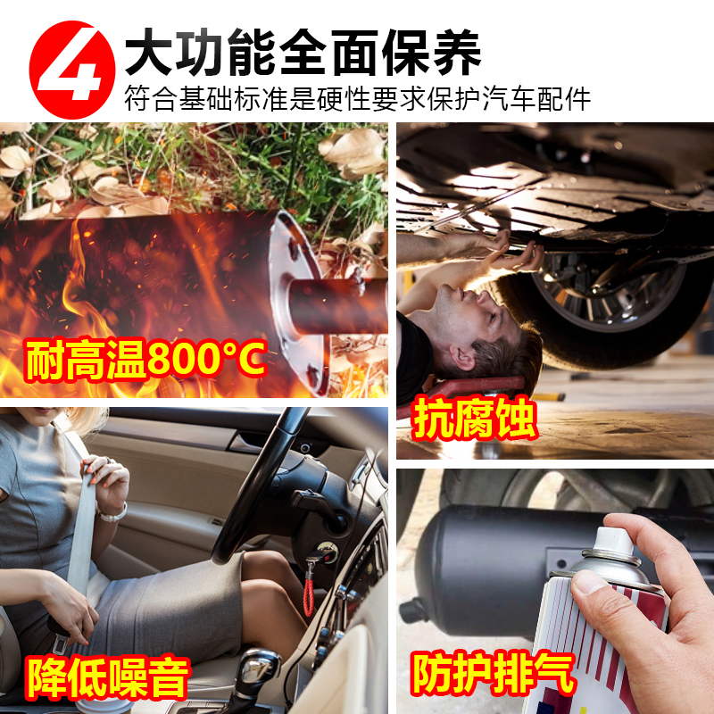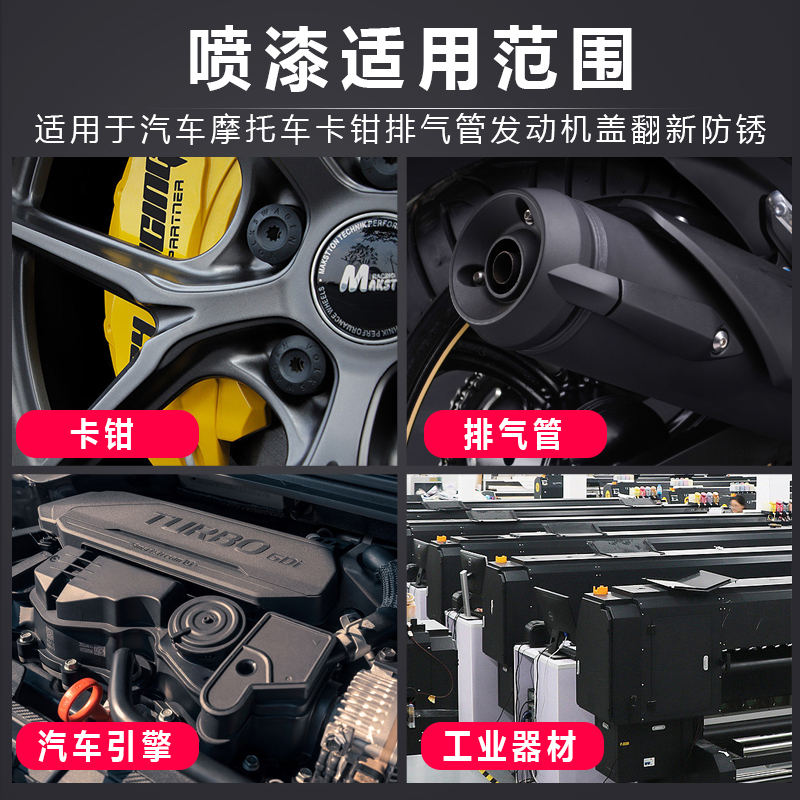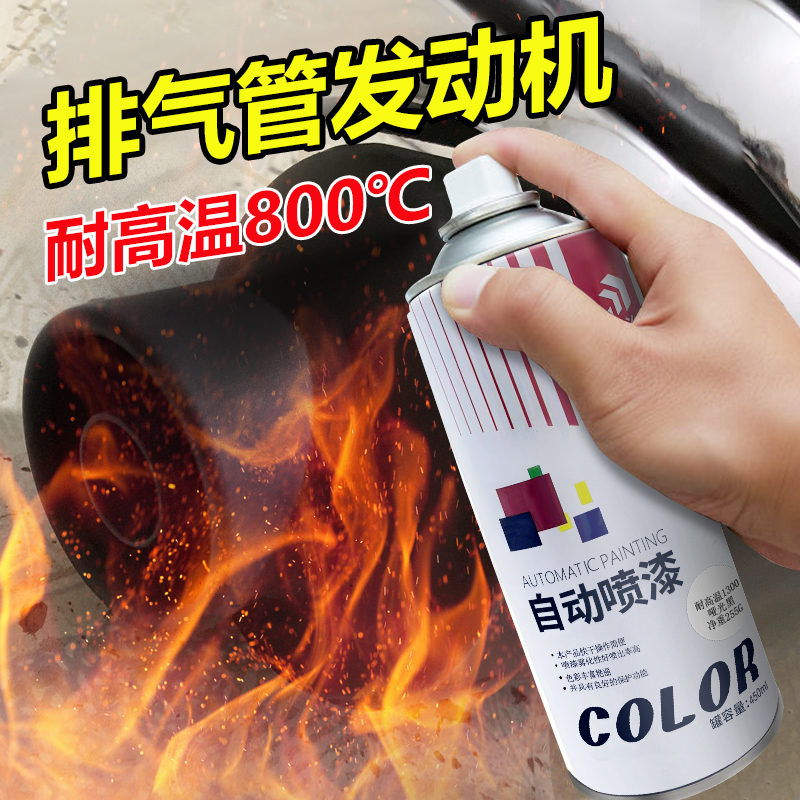 1.?耐高温性能?:该喷漆能耐800℃的高温,确保在高温环境下不易脱落或变质,适合用于排气管等高温部件的防护和美观。