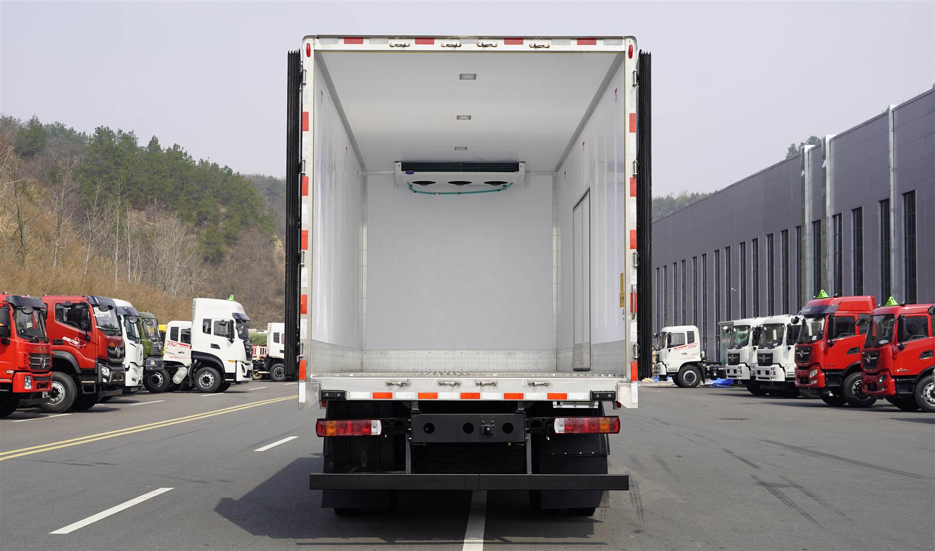 厢体配置:采用聚氨酯整体高压发泡成型生产工艺制造,厢体外采用预涂铝合金铆接,厢体厚度8CM,保温材料为40-50kg/立方高密度聚氨酯发泡,内蒙皮采用食品级(FDA认证)自带通风槽VR板材,无空隙高压整体灌注发泡压板技术(行业技术水平),厢体副梁与横梁为冷铆工艺连接,箱内底板矩形满焊通风槽,箱内300MM高裙边护板,铝合金型材包边,304不锈钢门框,加厚型不锈钢后门合页及锁件,厢体内部采用LED照明灯及厢体示宽灯。