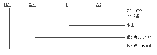 深水曝气搅拌两用机由潜水电机、减速装置、叶轮、混合室、底座和进气管等组成。深水曝气搅拌机的叶轮在混合室内旋转、吸入压缩空气。由于特殊结构的叶轮与混合室相对转动,空气被切割成很小气泡,与此同时水被吸进与被切碎空气完全混合,气液混合体以由混合室四周的通道以水平方向喷射出去。这样,微小气泡被均匀地充入液体中曝气,增加了气液二相表面的接触提高了曝气系统的效率,如此形成的大交换面积和喷射出的气液射流的高湍流度,可使氧的转移率和充氧量极大提高。