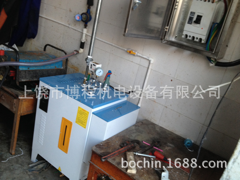 安装及操作流程 1.开箱后先安装好安全阀、出气阀、压力控制器及压力表,并将压力控制线按照编号接在压力控制器上。 2.把自来水管与进水管接通,打开自来水阀门供水,水箱内设有自来水位控制装置。 3.接通电源,然后合上电源开关,加水指示灯亮,水泵开始工作并向炉胆供水;待到设定水位,加水指示灯熄灭,加热指示灯即亮,3-4分钟左右内蒸汽压力即达到额定压力,此时便可打开出气阀,使用蒸汽。