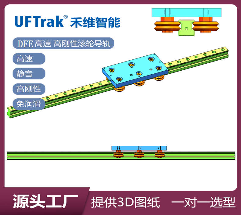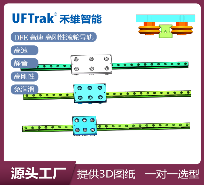 新推出的UFTrak高刚性滚轮导轨DFE,DFR,SFE,DAK,DAH系列,采用钢制轨道比简单的铝制底座更耐磨,拥有更高精度的传输能力,能承受更大的载荷;